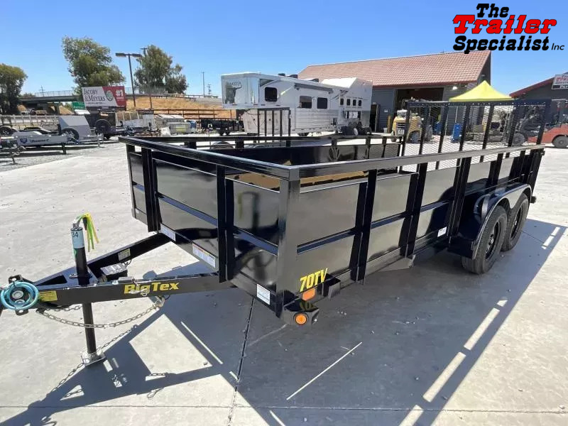 *** New 2026 Big Tex 70TV-16BRK2 Tandem Axle Utility Trailer The 2026 Big Tex 70TV Tandem Axle Vanguard Trailer is designed to handle demanding tasks with ease. Its sturdy construction and high sides make it the perfect solution for everything from heavy-duty landscaping to hauling large lawn and garden equipment. Key Specs: * Dimensions: 7’ x 16’ * GVW: 7,000 lbs * Empty Weight: 1,946 lbs * Axles: Two 3,500 lb axles, with one featuring electric brakes * Sides: 24” tall V-crimped steel panels * Floor: 2” treated pine or Douglas fir * Tires: ST205/75R-15 Load Range C radial tires Features for Reliable Performance: * Robust Frame: A 4” channel fold-back tongue and a 4” x 3” x 1/4” angle frame provide exceptional strength. * Secure Cargo: The 24” tall V-crimped steel sides and a 2” x 2” square tubing top rail keep your cargo safely contained. For extra security, the trailer includes four tie-down loops inside the bed and four stake pockets on the outside frame. * Smooth Towing: With a multi-leaf spring suspension system and an adjustable 7,000 lb forged coupler, this trailer offers a stable ride. * Enhanced Safety: Equipped with a complete break-away system with a charger and forward self-adjusting electric brakes, you can tow with confidence. The L.E.D. lighting package and protected wiring ensure visibility and reliability. * Convenience: The trailer features a 2,000 lb set-back jack with a removable sand foot, tear-drop style fenders with backs, and quick lubricating hubs for easy maintenance. Built with a superior quality finish and professional cleaning process, this trailer is made to last. *** *Please note: While we strive for complete accuracy, it’s always best to verify all specifications with a sales representative.*