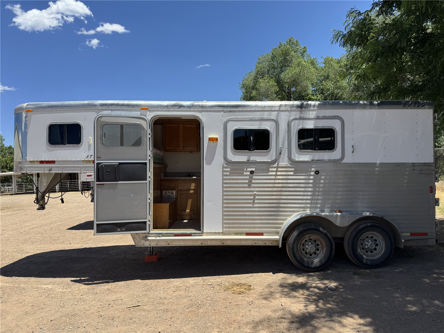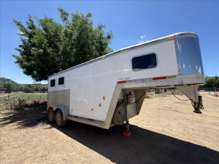 Exiss 2-horse weekender trailer for sale. 4' short wall. Converted by professionals. Real oak wood. Insulated roof, insulated under bed, and insulated walls in the weekender. 30 amp. Cold water pump, icebox, 3-burner propane stove. No toilet/shower. New battery. New electric jack motor. Dropdown windows on head side. Sliding windows with screen butt side. Padded dividers. Collapsible rear tack. Floor is great condition. Tapered nose: we’ve pulled with short bed and never touched the truck rear window. Can pull easily with 3/4 ton truck. 17k obo. Located in Durango, CO