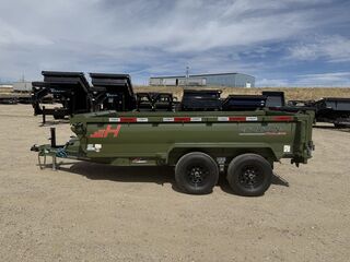Bumper Pull2 - 5.2K Lippert Electric Brake Auto Adjust EZ Lube Spring AxlesST225/75R15 Tires (10 ply) w/Black Mod WheelsWeld on Spare Tire Mount2-5/16” Adjustable BP Coupler (17K)1 - Side Wind Spring Loaded Drop Leg Jack (7K)Lockable Toolbox Houses Battery & Pump3 Way Door Gate - Spreader GateRamp Pockets w/5’ Long Slide in 3” Channel Ramps14ga. Diamond Plate Steel Fenders2’ Sides4 D-Rings Welded Inside Bed6” I-Beam FrameNeckboss 6” Engineered I-Beam Tongue1/4” Grade 70 Safety Chain w/Clevis Hook3” Channel 16” Spacing Crossmembers2 Button Hydraulic - Power Up/Power Down Pump1 - Interstate 27 Deep Cycle Battery110V Integrated Trickle ChargerManual Tarp KitAll-Weather Wiring Harness (7-Way RV)Powdercoat Military Green9 ga. Steel Bed
