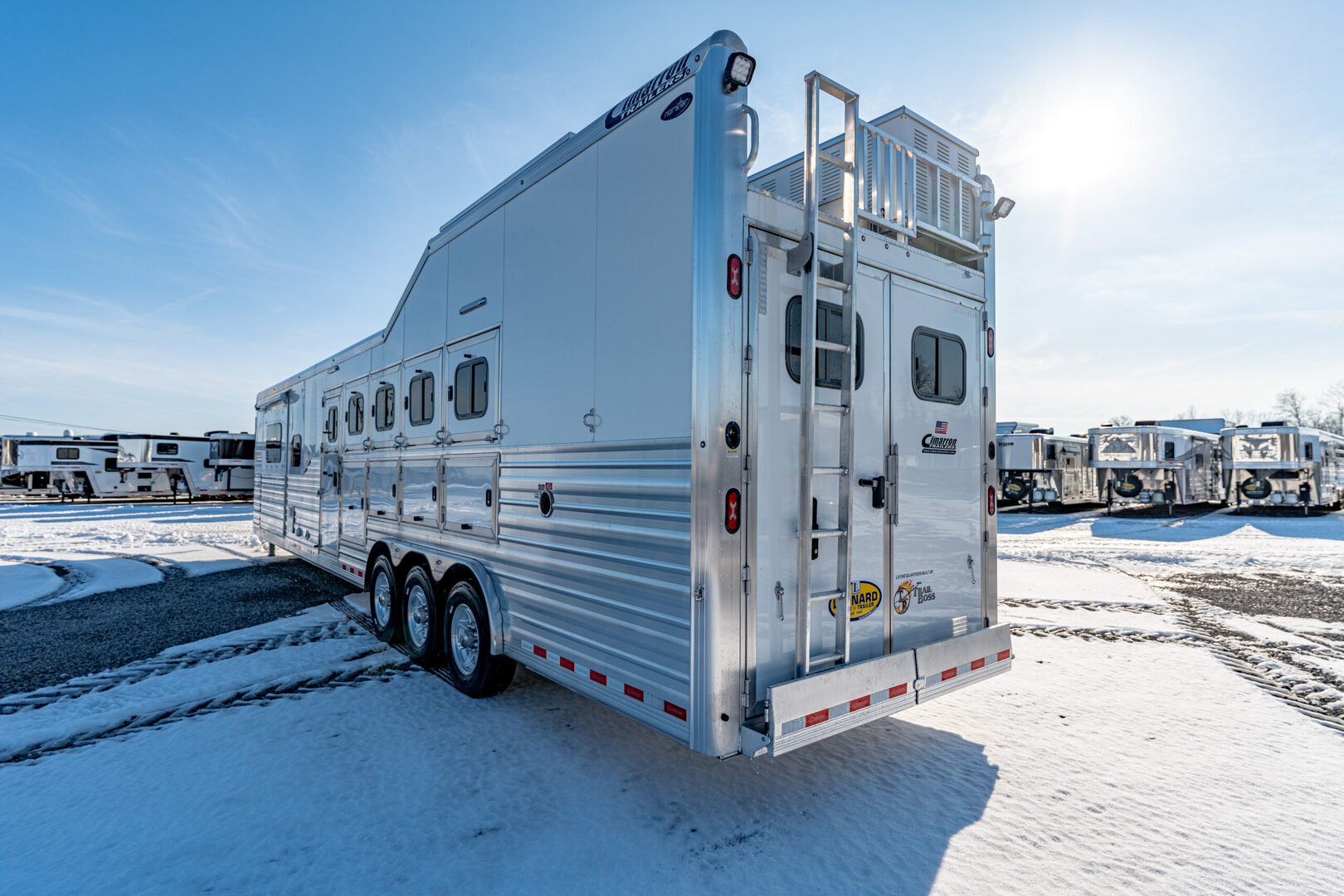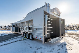 View Inventory: https://leonardtrailers.com/inventory/44911 Stock# 4491 New 2026 Cimarron NS5G-156 Side Load Gooseneck  LQ Horse Trailer Cimarron aluminum horse trailers are engineered to be durable and safe. Bumper pull or gooseneck configurations ensure effortless towing and comfort. Model: NS5G-156 Warranty: 8yr- Structural 3yr-Body and Hardware Trailer Specifications Dimensions Box Length: 38’ - 9” Box Width: 8’ - 0” Box Height: 7’ - 10” Undercarriage Axles: 8,000 lb  GVWR: 24,0000 lbs Brakes: Electric/Hydraulic, Disc Brakes Tires: Cooper 245/70 R17.5” LR-J Wheels: 8-hole aluminum spoke, 17.5” Design Nose Profile: Tapered sides, 18” radius corners Nose Sheet: Polished stainless steel Side Walls: Extrended Side Slat to GN Sheet Color: White Roof Material: Insulated roof panel Fenders: Teardrop Overall Width: 102” OAW Side Opening Ramp: 57” tall x 65” Wide  Dividers Type: Break Over Bar x1 Type: Full Bar Type x2 Head Grills Bar type Miscellaneous D-Rings: 3 Padding: 1 head, 8 side Lining: Kick mat – 48” high w/ .090 PL & insulation on LH & front wall; 54” high on RH walls Floor Mat: Removable VET type Hardware & Accessories Dome Lights: Optibrite LED (7) Bridle Hooks: Set of 4 Brush Trays: 2 Pop-up Vents: 2 Hold Up Steps: 3 Special Requirements Added recessed paddle latch on side access door on #1 stall Side Acess door 39” on RH side of #5 stall for side load #5 Stall is 48” wide for side load  Internal 2-point spring latches w/butterfly latch exterior, ILO 2 cam Locke rear tack doors Carpet all walls & doors of full rear tack  We offer outstanding financing options, accept trades, and can arrange nationwide NO HASSLE delivery! Inquire today for more information! (888) 333-6613 **We believe these specifications to be accurate. Any discrepancies are unintentional. Please verify information with a sales associate prior to purchase.** Stock Number:44911