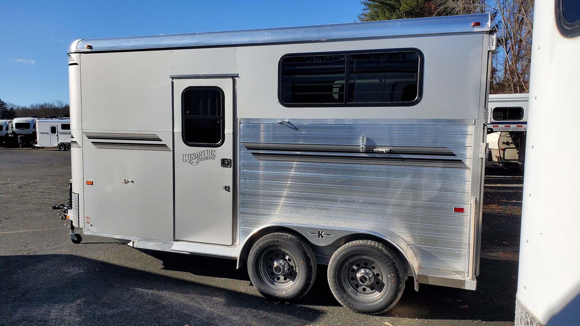 New 2026 Kingston Classic Elite Warm Blood w/ Dressing Room. Legendary name and reputation! Manufactured here in Massachusetts. All aluminum construction. Warm Blood model offers longer stall length, more head room, taller chest and butt bars, and more! Elite package includes all the most popular features, including additional padding, windows all around, rubber lined walls beside stalls, and more! Spacious dressing room with saddle racks, bridge hooks, and clothing bars. Durable pressure-treated wood flooring with rubber mats. Dual Escape Doors. Easy lift rear ramp. Dexter Torflex Axles. Spare tire. Silver Exterior Skins. Call today for more information!                 Pricing may not include tax, title, prep, documentation, or freight. Please call for details.