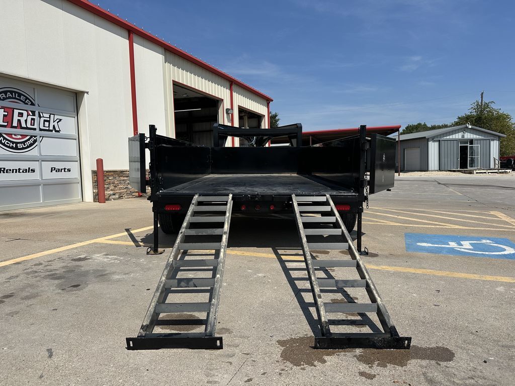 83 in x 14ft Tandem Axle Gooseneck Dump 2 x 7,000 lb. Dexter E Z Lube Axles W/Electric Brakes on Both Never Adjust Electric Brakes On All Hubs 2 5/16 in Adjustable Gooseneck Coupler (25K) 2 x 12K Drop Leg Jacks (Bolted On) 10 in I Beam Neck Tarp Included With Full Formed Shroud And AntiSail Bar ST235 80R16 in Radials 16 Load Range E (8 Hole). Black Mod Wheels Lockable Pump and Battery Box Fully SelfContained Elec. Hyd. Scissor Lift Power Up & Down Built In 110V 5 AMP Charger 24 in Sides Combo Rear Gate Spare Tire Mount (Mount Only) 6ft SlideIn Ramps (Rear) LED Lights 13 Stake Pockets (Sides & Front) 10 Ga. Steel Floor 24 in 12 Ga. Sides 7Way RV Plug Empty Weight 4,805 lb. G.V.W.R. 15,900 lb. Carrying Capacity 11,095 lb.