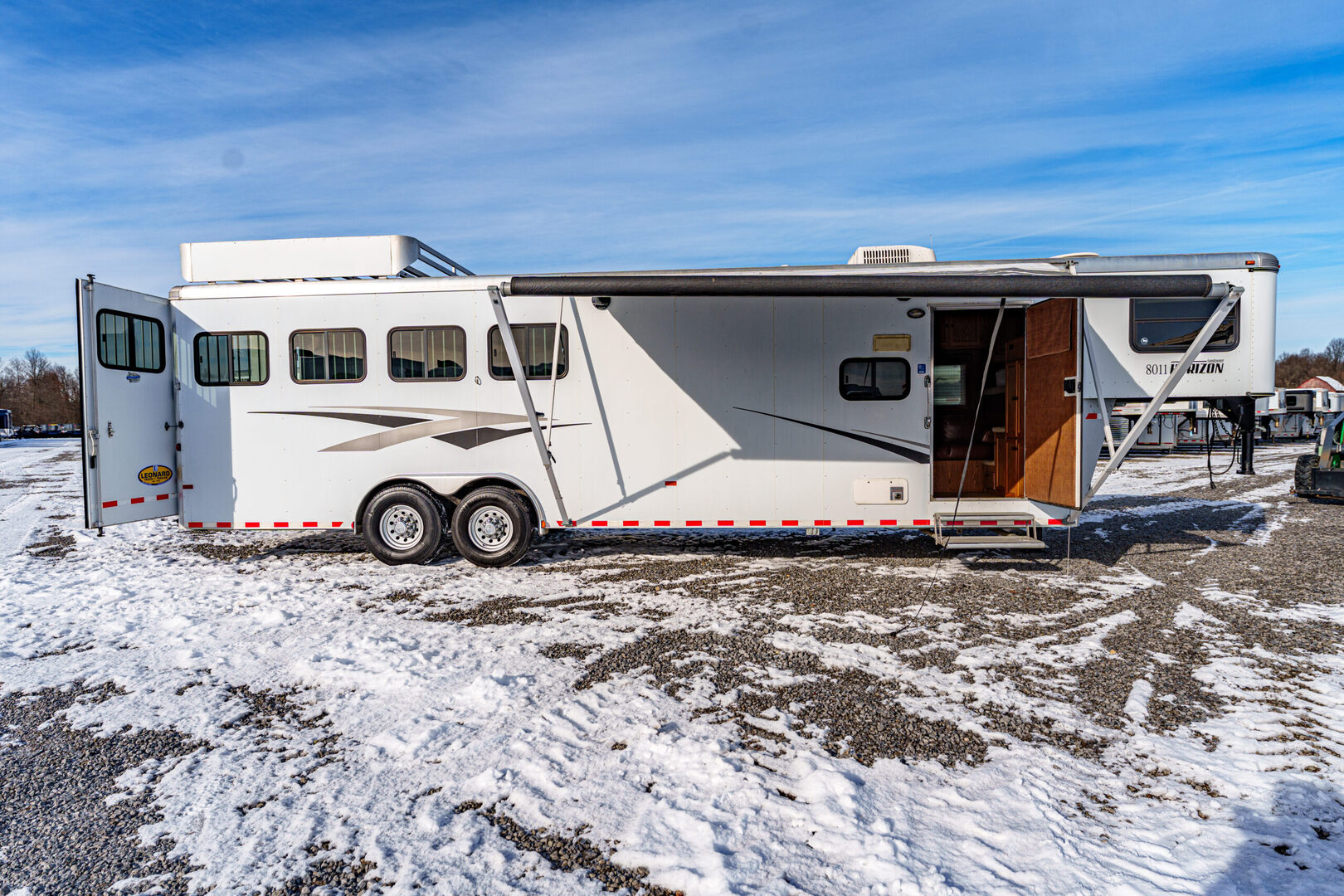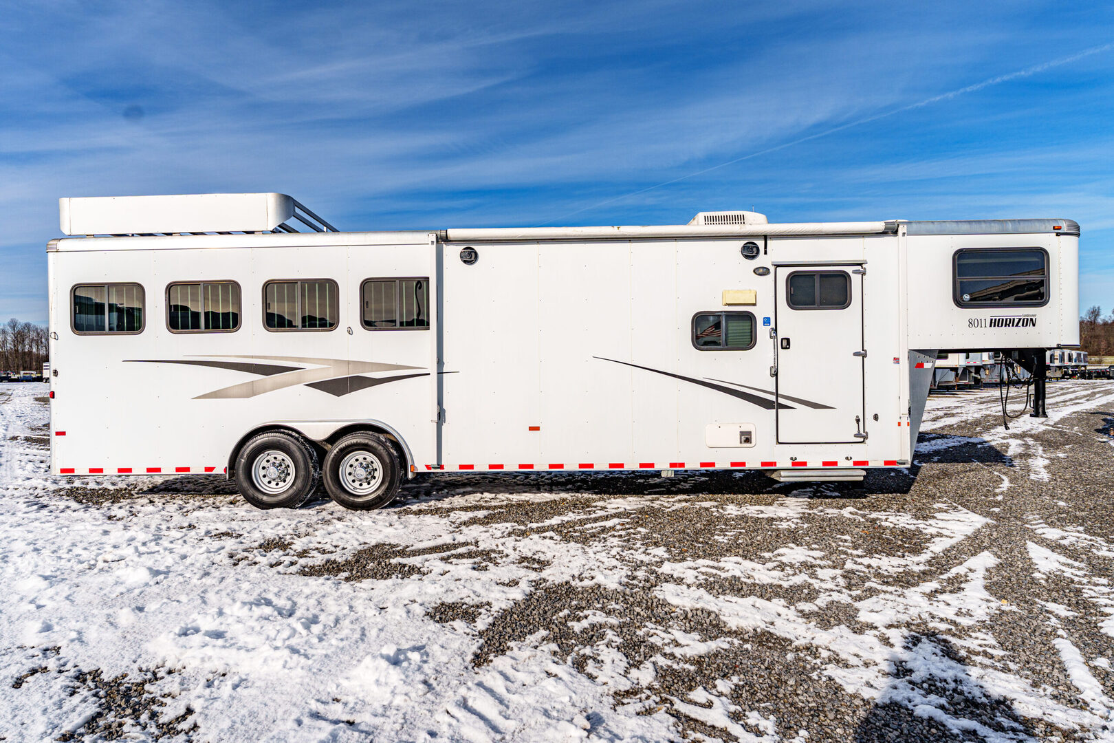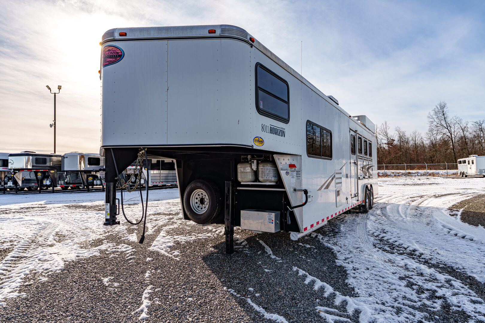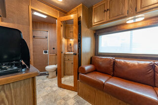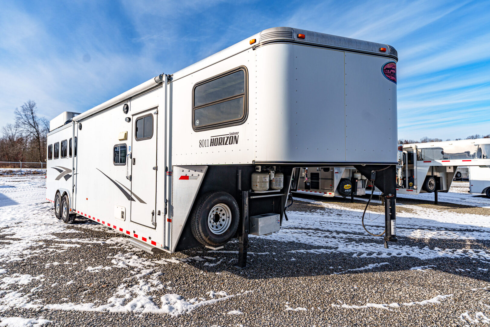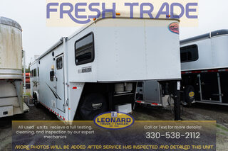 View Inventory: https://leonardtrailers.com/inventory/44959 Stock# 44959 Used 2009 SUNDOWNER 4 Horse GN - LQ Trailer    General Information Construction: Steel frame with aluminum skin Coupler Size: 2 5/16” Roof: Aluminum Primary Color: White Length: 29’ Width: 8’ Height: 9’ Horse Area Type: Slant Rubber Lining: Complete Escape Type: 1 Full Walk Out Tack Area Type: Rear Collapsible, Inside Dress Feed Doors Saddle Racks Outside Tack Doors Dressing RoomType: Slant Options: Lined/Insulated  Carpet  110V Package  Living Quarters Size: 10’ Options: Access to Horse Area  Air Conditioning Furnace / Heat Strip  Sofa / Dinette  Sink / Kitchen  Stove / Refrigerator  Microwave / Oven  Sink in Bath  Toilet / Shower  Slide Out  Specifications GVW: 15,210 lbs Axle Size: 7,000 lbs Tire Size: 16” # of Brakes: 4 Brakes: Electric Ride Type: Rubber Ride Jacks: Single Hydraulic We offer outstanding financing options, accept trades, and can arrange nationwide NO HASSLE delivery! Inquire today for more information! (888) 333-6613 **We believe these specifications to be accurate. Any discrepancies are unintentional. Please verify information with a sales associate prior to purchase.** Stock Number:44959