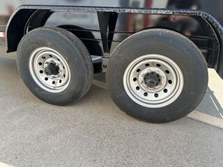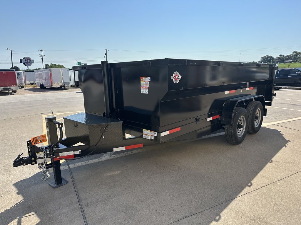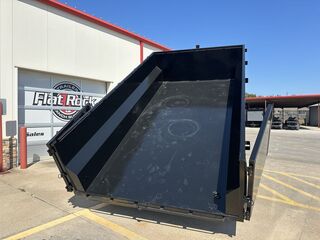 7’ x 14’ x 3’ Flare Side Dump Trailer (+/10.88 Cubic Yards) 2 x 7,000 lb. EZ Lube 8 lug (12 in x 2 in brakes on both axles) Heavy Duty Slipper Spring Suspension Tires: New ST235/80R16 LRE 10ply radials (3,520 lb.) Main Frame: Full Side 6 in x 2 in x 3/16 in Heavy Wall Tube With 6 in Channel Front and Back Wrapped Tongue: 6 in Channel Tilt Frame: 3 in x 2 in x 3/16 in Heavy Wall Tubing Spare Tire Mount Cross Members: 3 in Channel Bed Flooring and Siding: 1/8 in Steel Deck width: 82 in Deck Length: 14’ Deck Height: Approximately 28 in Side Wall Height: 36 in Rear Doors: Double Swing Doors (open like barn doors) Battery: Group 24 Deep Cycle Marine Controller: 15’ corded remote control Toolbox: Front locking toolbox contains battery and pump Hydraulics: Single 3 stage hydraulic cylinder (14,000 lb.) Coupler: 4 hole adjustable height 2 5/16 in ball Safety Chains: Two heavy duty safety chains 10,000 lb. Drop Leg Jack Fenders: 14ga heavy duty tread plate Lighting: All flush mount or recessed lifetime LED DOT required emergency break a way kit and conspicuity tape Finish: Primed / painted with 2 coats of auto. grade acrylic enamel Empty Weight 4,000 lb. G.V.W.R. 14,000 lb. Carrying Capacity 10,000 lb.