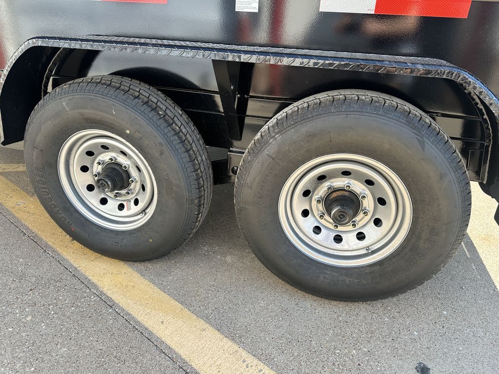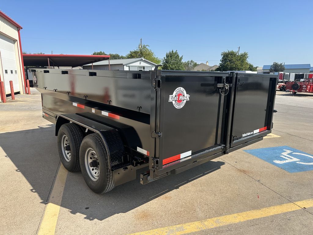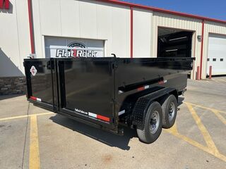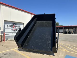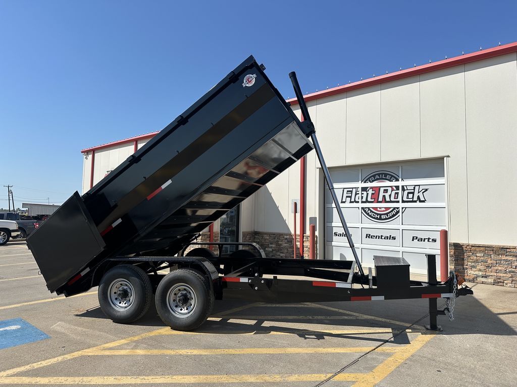 7’ x 14’ x 3’ Flare Side Dump Trailer (+/10.88 Cubic Yards) 2 x 8,000 lb. EZ Lube 8 lug (12 in x 2 in brakes on both axles) Heavy Duty Slipper Spring Suspension Tires: New ST235/85R16 LRE 14 ply radials Main Frame: Full Side 6 in x 2 in x 3/16 in Heavy Wall Tube With 6 in Channel Front and Back Wrapped Tongue: 6 in Channel Tilt Frame: 3 in x 2 in x 3/16 in Heavy Wall Tubing Spare Tire Mount Cross Members: 3 in Channel Bed Flooring and Siding: 1/8 in Steel Deck width: 82 in Deck Length: 14’ Deck Height: Approximately 28 in Side Wall Height: 36 in Rear Doors: Double Swing Doors (open like barn doors) Battery: Group 24 Deep Cycle Marine Controller: 15’ corded remote control Toolbox: Front locking toolbox contains battery and pump Hydraulics: Single 3 stage hydraulic cylinder (14,000 lb.) Coupler: 4 hole adjustable height 2 5/16 in ball Safety Chains: Two heavy duty safety chains 12,000 lb. Drop Leg Jack Fenders: 14ga heavy duty tread plate Lighting: All flush mount or recessed lifetime LED DOT required emergency break a way kit and conspicuity tape Finish: Primed / painted with 2 coats of auto. grade acrylic enamel Empty Weight 4,000 lb. G.V.W.R. 16,000 lb. Carrying Capacity 12,000 lb.
