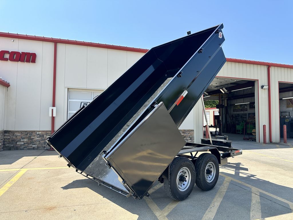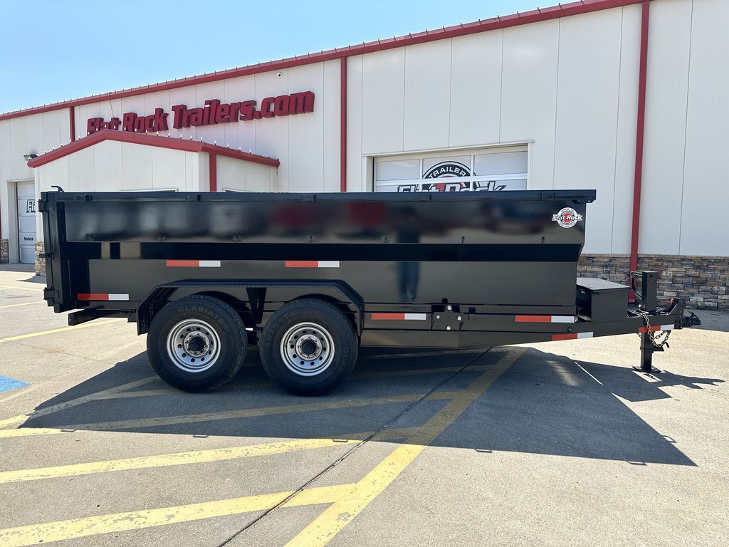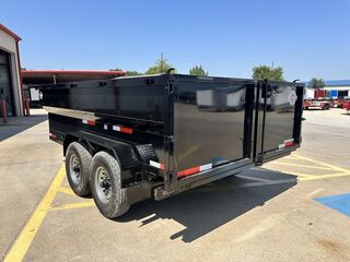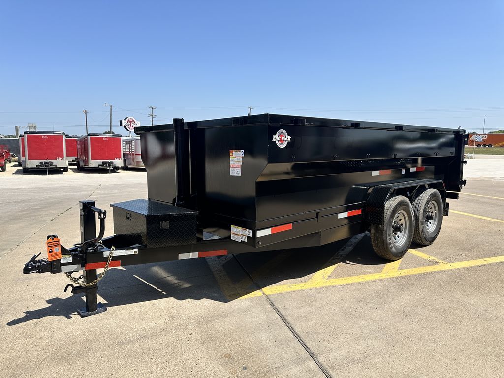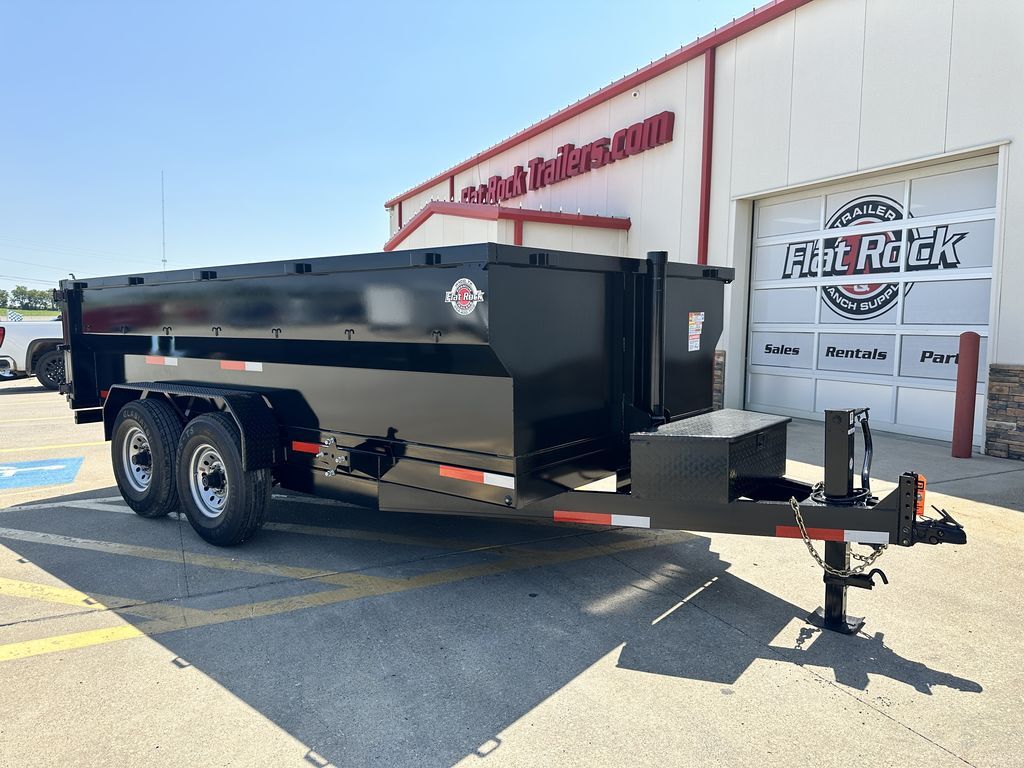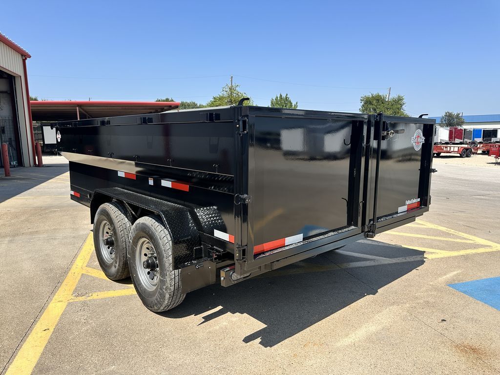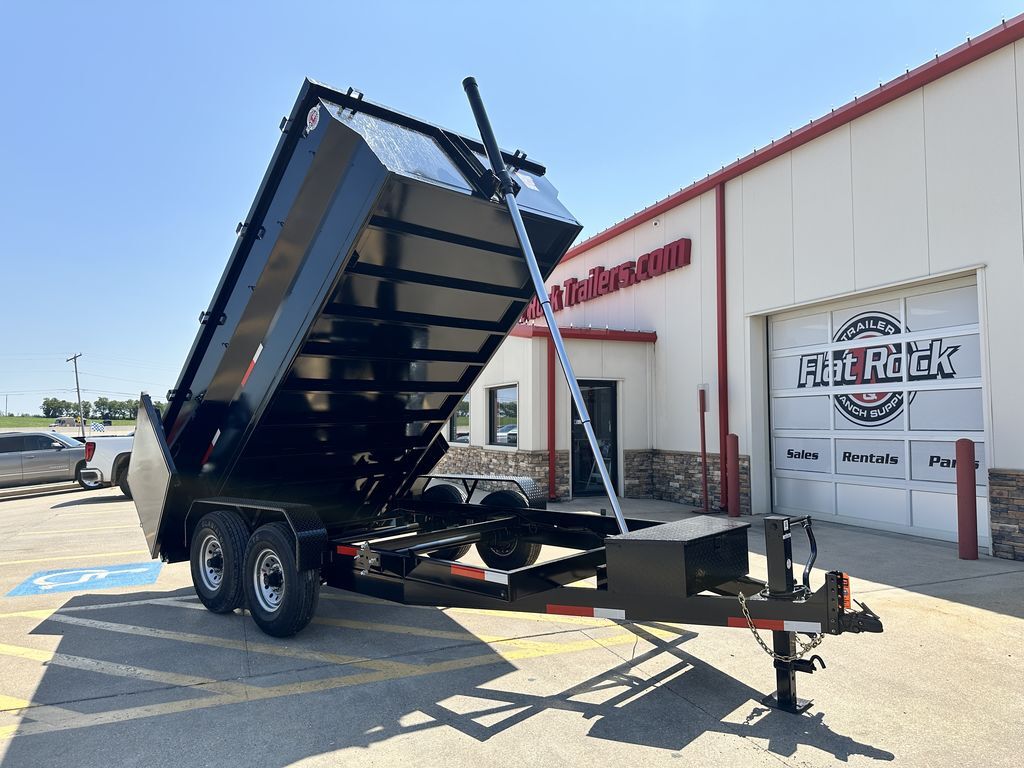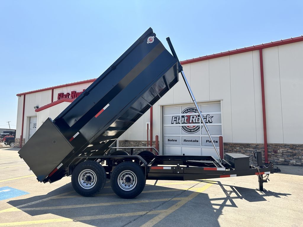7’ x 14’ x 3’ Flare Side Dump Trailer (+/10.88 Cubic Yards) 2 x 8,000 lb. EZ Lube 8 lug (12 in x 2 in brakes on both axles) Heavy Duty Slipper Spring Suspension Tires: New ST235/80R16 LRE 14 ply radials Main Frame: Full Side 6 in x 2 in x 3/16 in Heavy Wall Tube With 6 in Channel Front and Back Wrapped Tongue: 6 in Channel Tilt Frame: 3 in x 2 in x 3/16 in Heavy Wall Tubing Spare Tire Mount Cross Members: 3 in Channel Bed Flooring and Siding: 1/8 in Steel Deck width: 82 in Deck Length: 14’ Deck Height: Approximately 28 in Side Wall Height: 36 in Rear Doors: Double Swing Doors (open like barn doors) Battery: Group 24 Deep Cycle Marine Controller: 15’ corded remote control Toolbox: Front locking toolbox contains battery and pump Hydraulics: Single 3 stage hydraulic cylinder (14,000 lb.) Coupler: 4 hole adjustable height 2 5/16 in ball Safety Chains: Two heavy duty safety chains 12,000 lb. Drop Leg Jack Fenders: 14ga heavy duty tread plate Lighting: All flush mount or recessed lifetime LED DOT required emergency break a way kit and conspicuity tape Finish: Primed / painted with 2 coats of auto. grade acrylic enamel Empty Weight 4,000 lb. G.V.W.R. 16,000 lb. Carrying Capacity 12,000 lb.