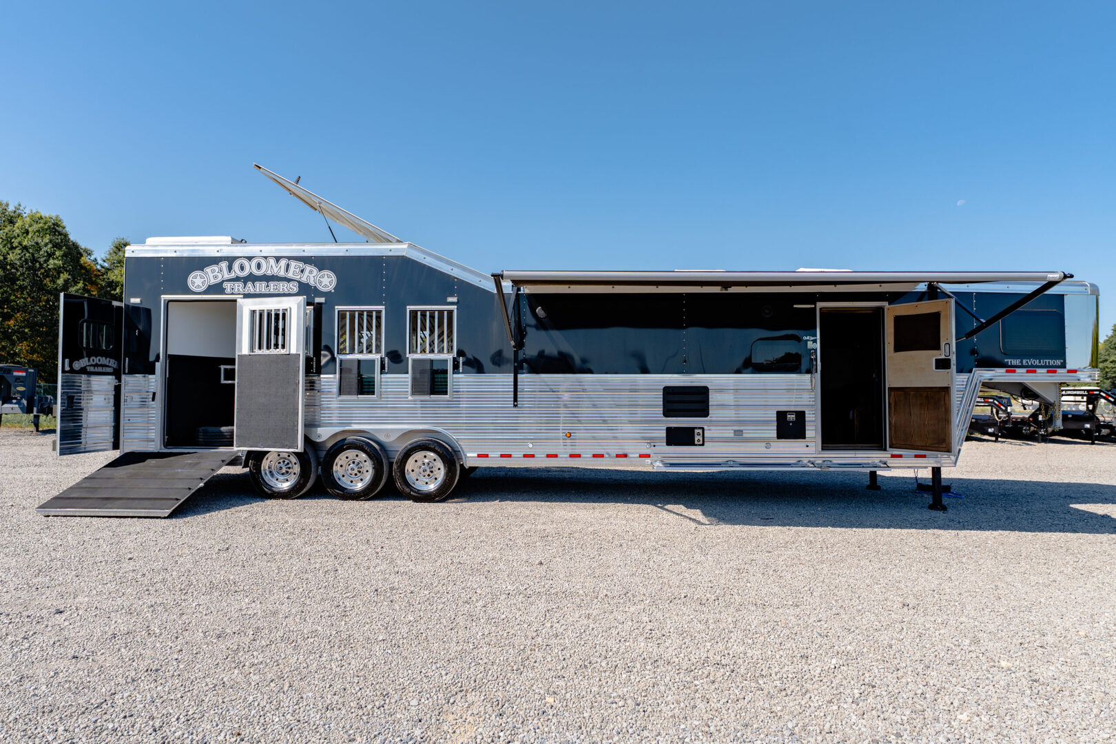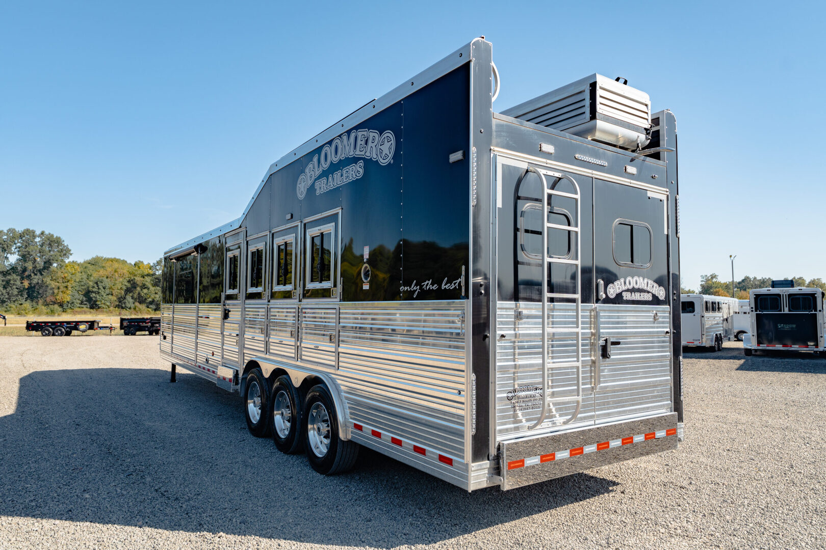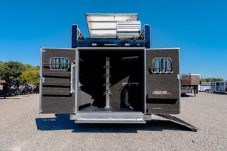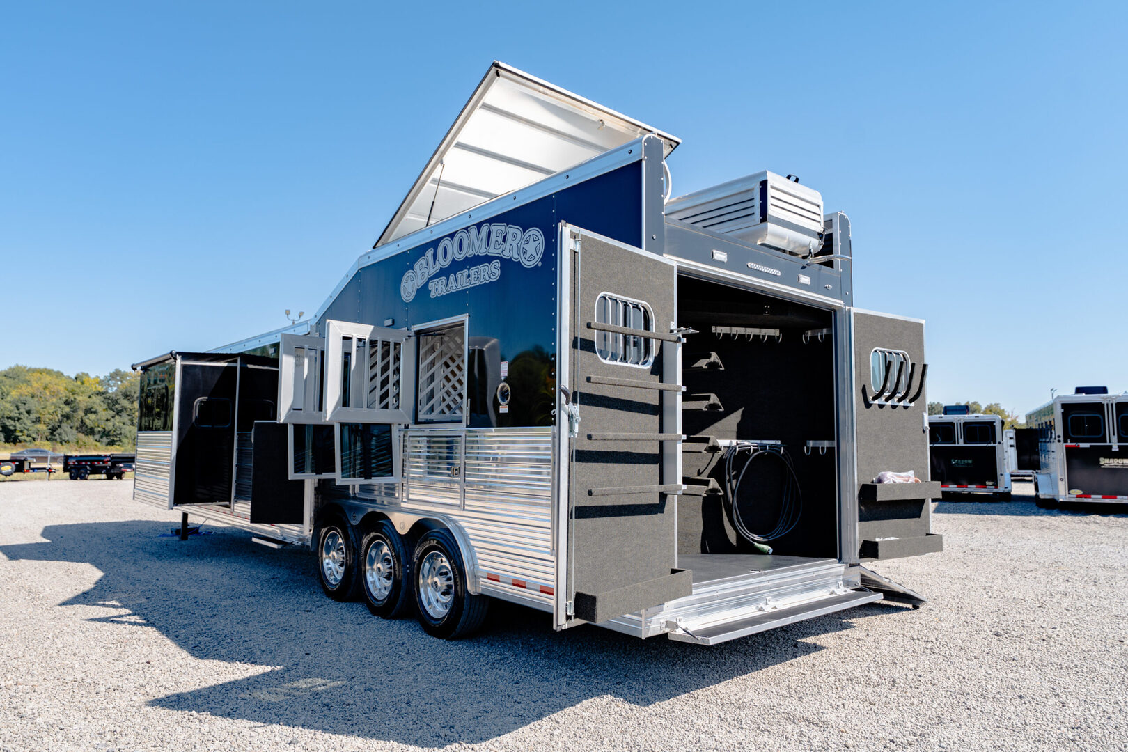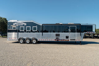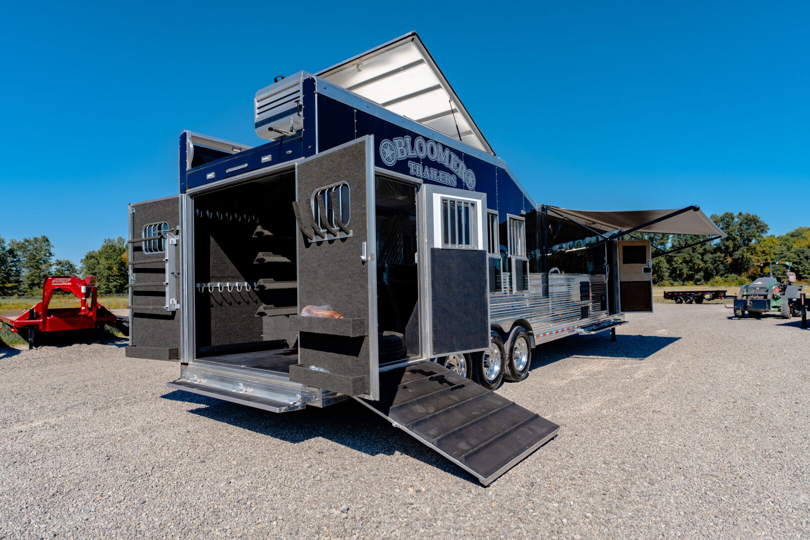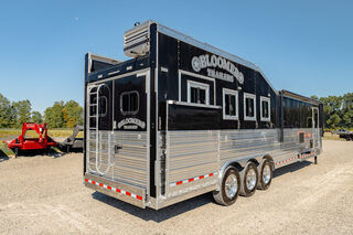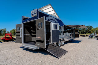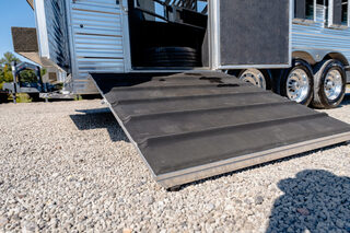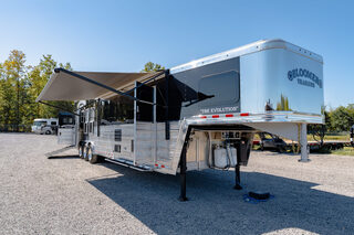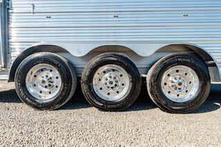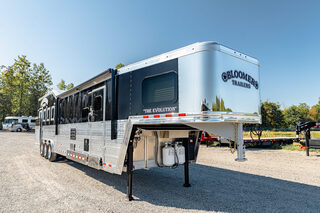 Every Bloomer trailer includes several advanced features, many of them – such as the integrated hay pod – pioneered by Bloomer Trailers. Using the best quality and materials, our products are made to maximize the safety and comfort of your family. Our founder and CEO, Randy Bloomer, has even ridden in our horse compartments to measure vibration levels and find ways to engineer the safest ride possible for your most prized possessions. We never take a shortcut when it comes to you or your horses’ safety. Standard Horse Trailer Features                                                                      Durability and Smooth Ride -Electric hydraulic disc brakes                                                                        - Torsion axles -Spin-balanced premium tires and HD aluminum wheels               - All 2” tube walls and roof construction -Machine-polished continuous slide slat                                                - .040 one-piece continuous roof skin -.050 pre-painted white skin             -Extruded tongue and groove aluminum floorboards with support legs every 6” -Roof cross members set at 16” centers              -Marine carpet on floor, drop and pan -30,000-lb 2-5/16” adjustable coupler               -10,000-lb drop leg jack Centromeric Wheel Balancers                          -Beveled fender wells – 45 degrees Polished top rail                                                                      Doors and Windows -All doors lined and insulated with integrated hinges          -24” X 24” Drop Windows with protective bars (hip side) -Dressing room door with window                                    -Swinging feed doors with drop down windows (head side) -Permanent window bars in feed doors                                  -15” x 34” sliding windows with protective bars (gooseneck) -50/50 rear doors with windows                                              -Shock-assisted, fold-up step at dressing room door -Swinging feed door Horse Compartment -Lined and insulated roof and walls                                          -Protective rubber on walls and floor -Padding on dividers and chest of each stall                             -Flow-through bars in head and wither shields -Spring-loaded dividers with slam latch                                         -Framed roof vent per stall -Two interior horse ties per stall                                                 -Two recessed spring-loaded exterior horse ties per stall -Shin guard at loading door Storage and Tack -Stationary double wall rear tack                                             -Lined and insulated -Two brush trays                                                                   -One saddle rack tier per horse (up to four) -Ten bridle hooks                                                                        -Blanket bar Electrical -Rocker-style exterior light switches                                   -One LED dome light per divider -Three LED loading lights                                                         -Front and rear junction blocks -All wire connections soldered and protected with shrink tube -All wire routed through aluminum, protected with rubber grommets               -Turn signals high and low Please call us for any info. Stock Number:44981