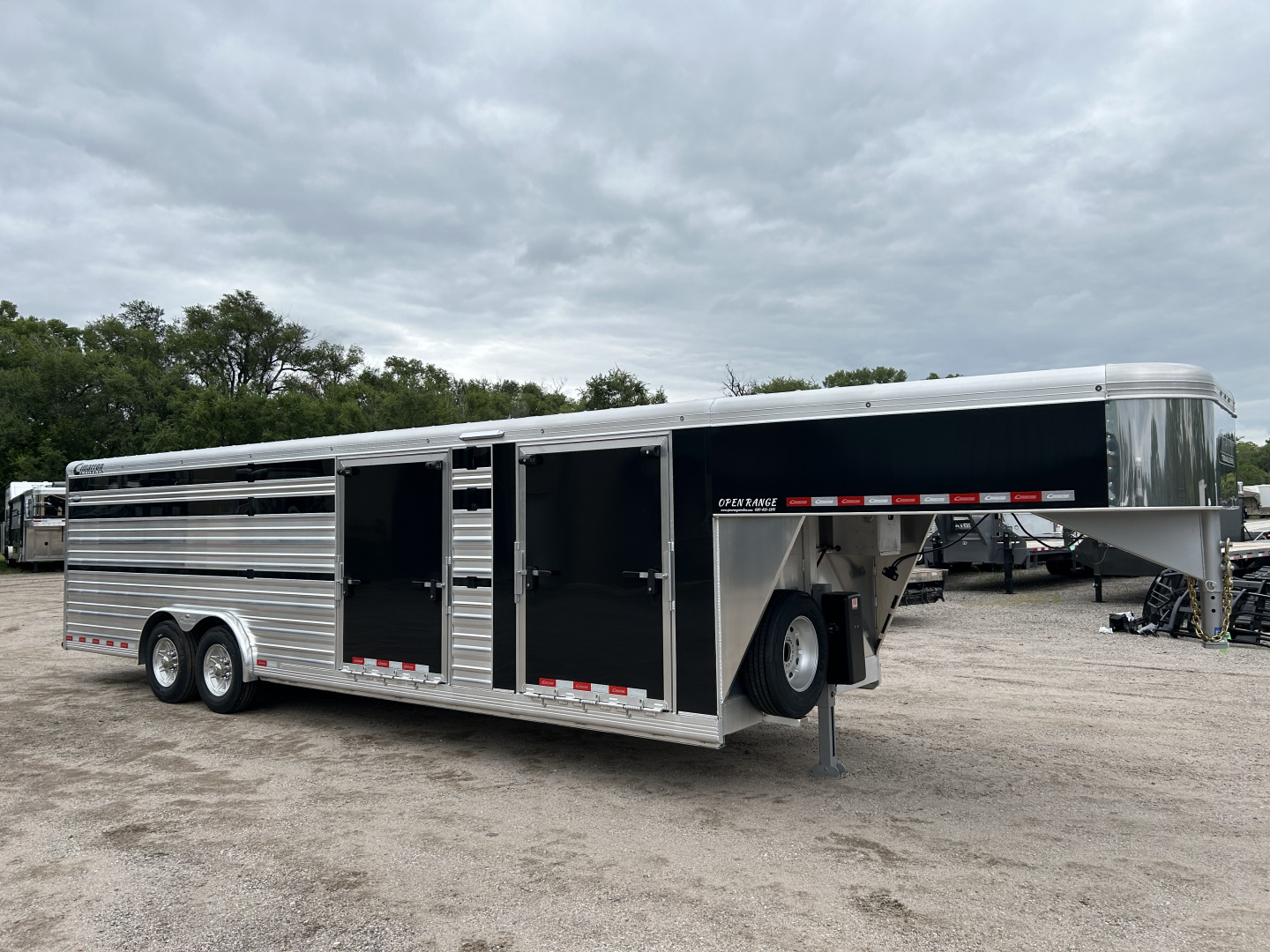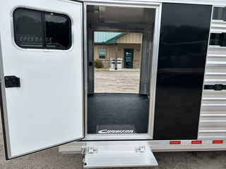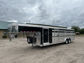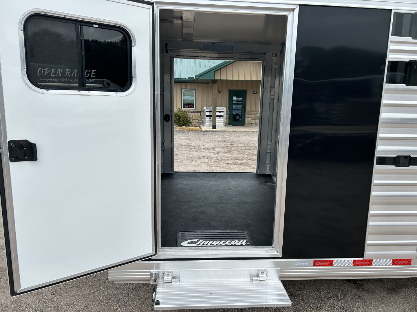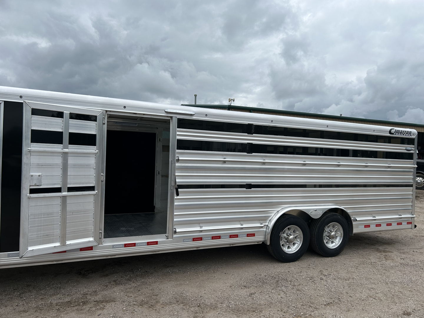 2026 Cimarron Lonestar Stock Combo 8’X 28’ GVWR 16K 2- 8K Torsion Axles Electric Brakes Cooper 245/70R17.5 J Range Tires 8 Hole Aluminum Black Spoke 17.5” Wheels Polished Stainless Steel Nose Sheet Mill Finished Side Extrusions Slat Sides With 3 Air Gaps w/Plexiglass Inserts Insulated Roof Panel EQ Hydraulic Jack 6’ Tack Room With 32” LH Side Door And 48” RH Side Ramp Rubber Mat In Tack Room Floor 22’ Stock Area With 2 Traveling Gates 48” RH Side Ramp In Stock Area Full Swing Rear Gate With 36” Slider Interior Tie Rail 28” & 48” On LH Side Exterior Tie Rail LH Side