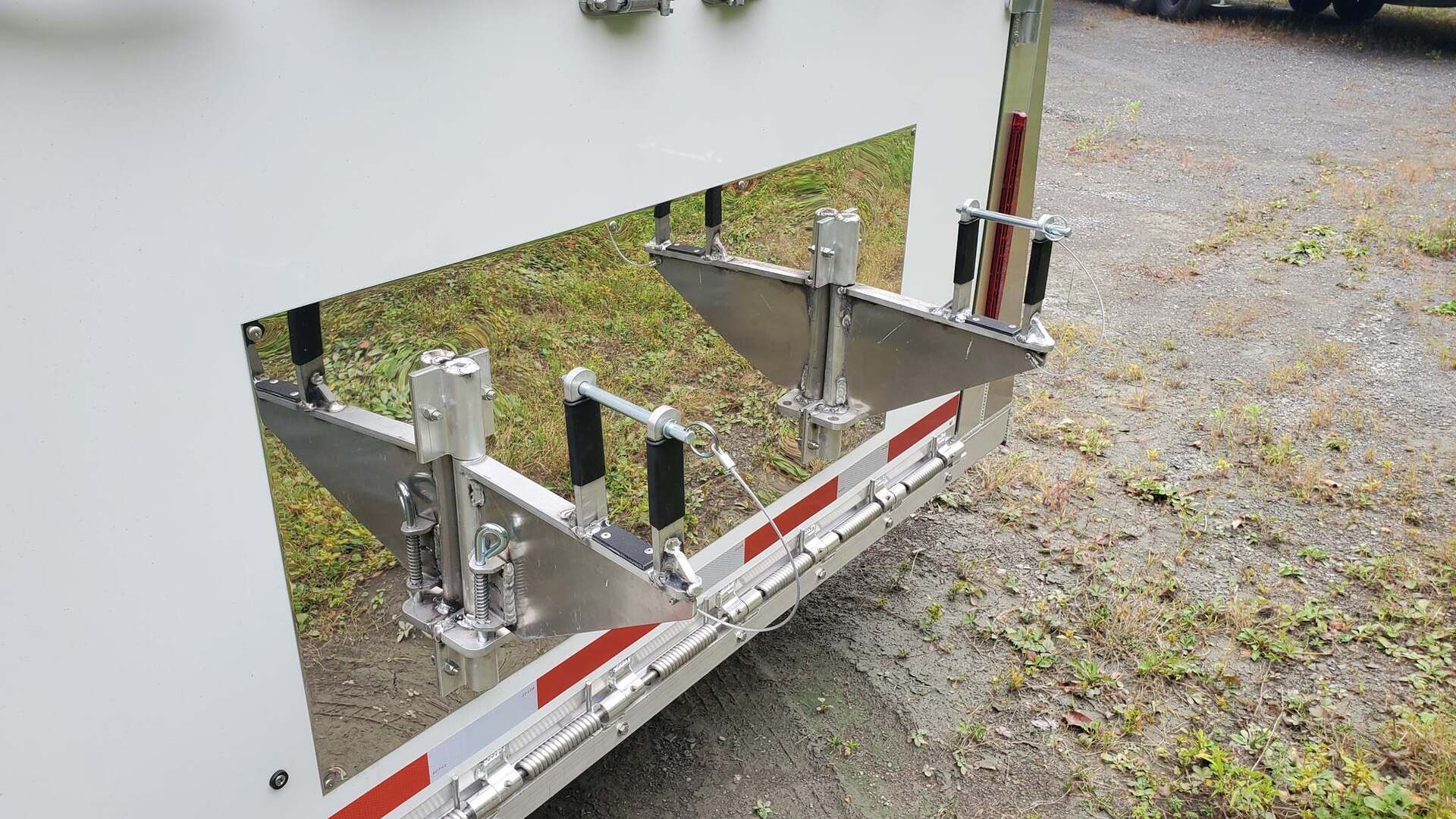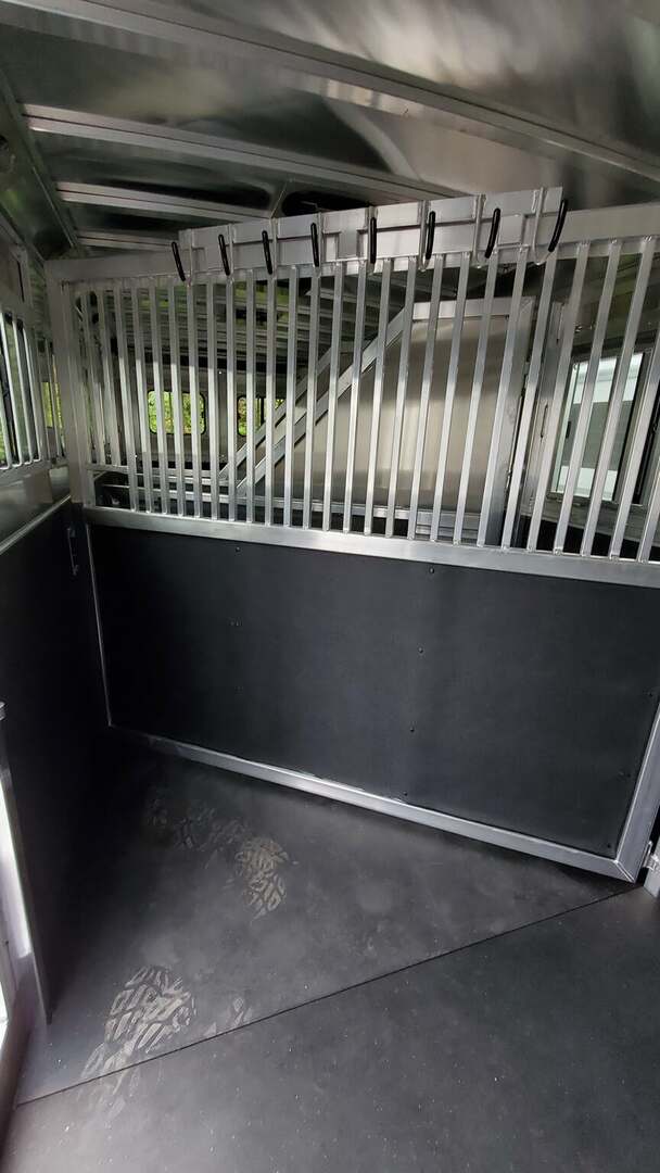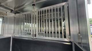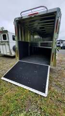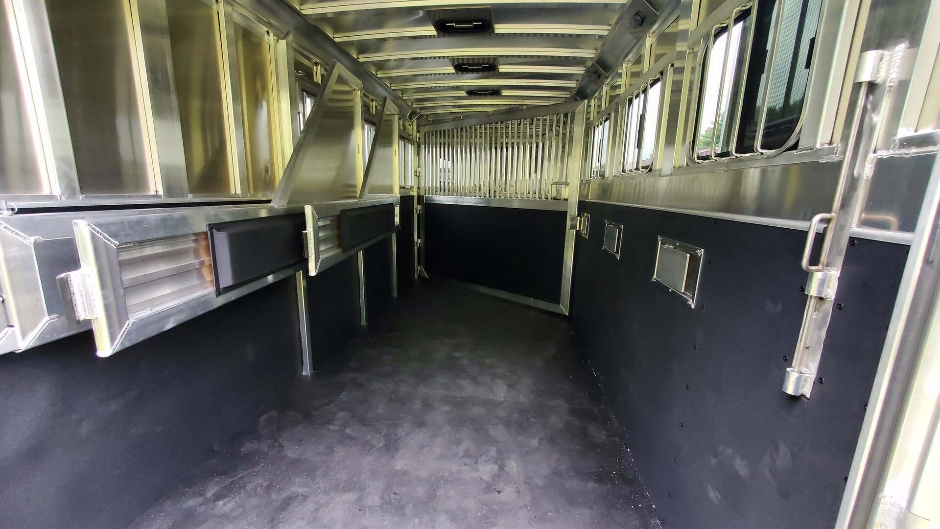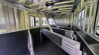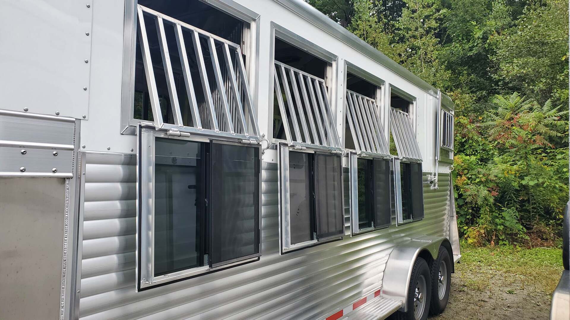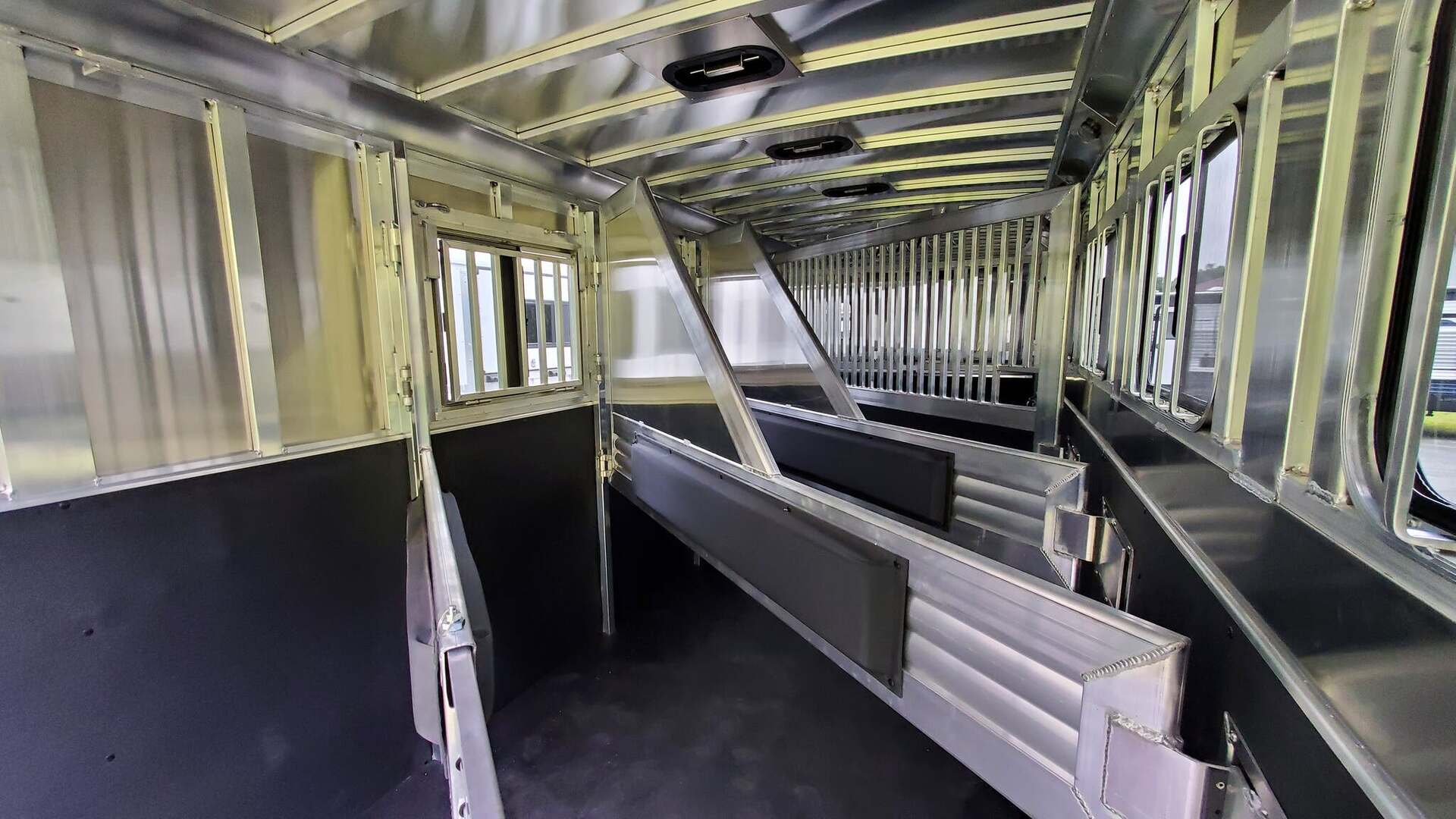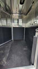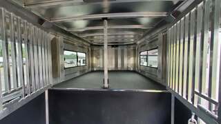 New 2026 Adam Pro-Racer 3+1 Slant-Load Horse Trailer. The industry’s gold standard model for utilitarian equine transportation. Perfect for moving race horses efficiently and safely. All-aluminum, commercial duty construction. Three slant-load stalls with option to move a 4th in dressing room/tack area upon opening divider wall. Drop feed windows on head side. Telescoping rear divider allows for closure of the rear with dividers in open position. Easy Lift Rear ramp. Removable gates in gooseneck. Dexter Torsion Axles. Folding sulky racks and top shaft loops in rear. Call today for more info!