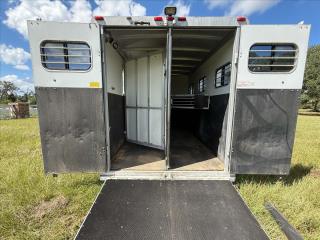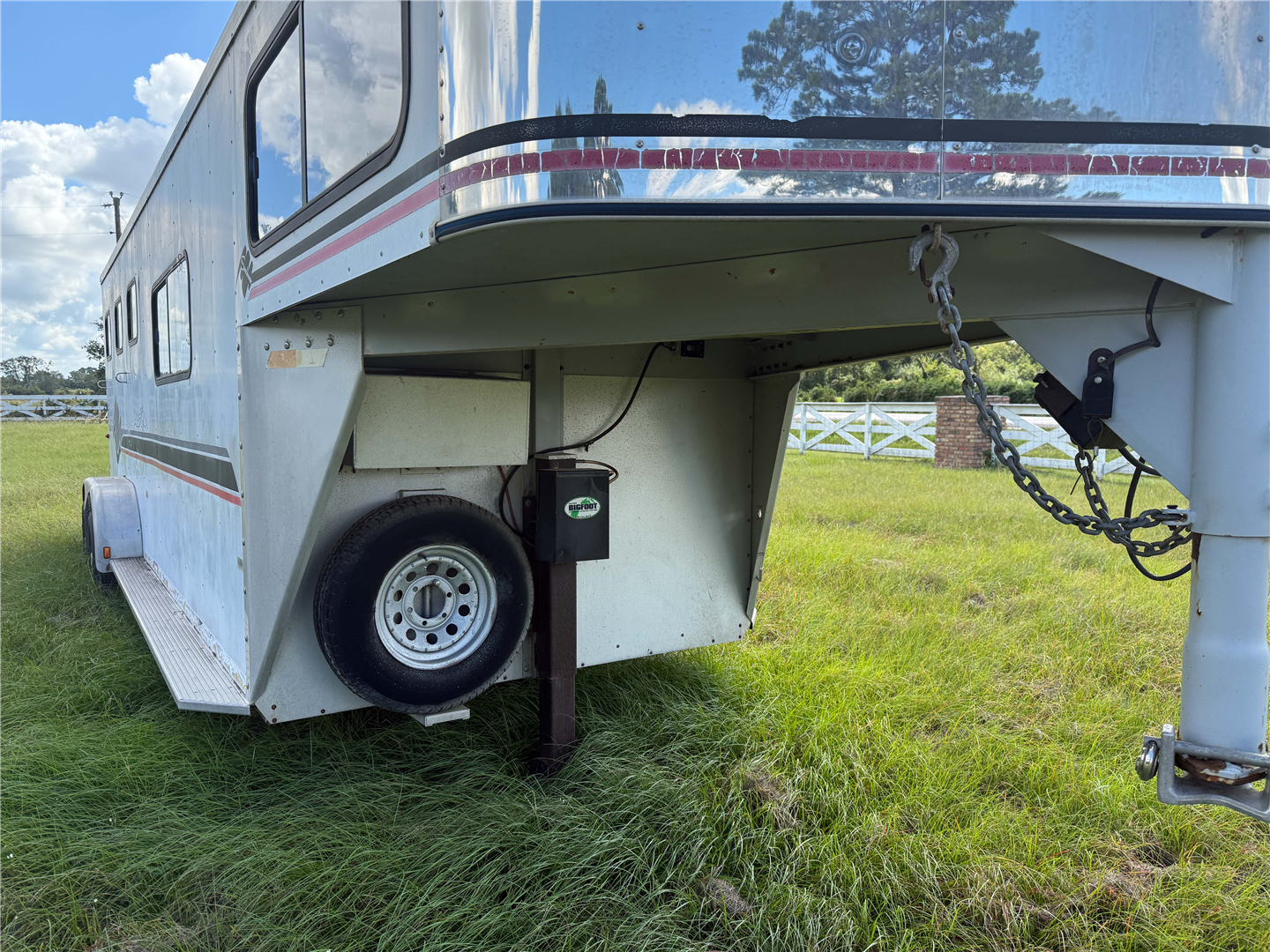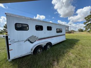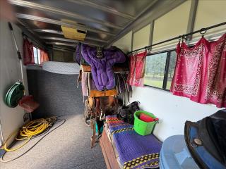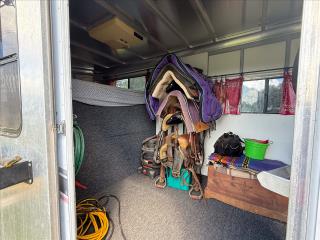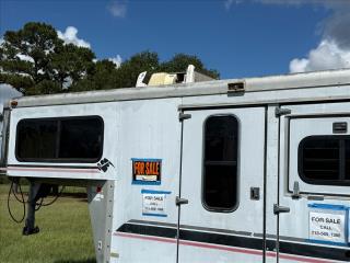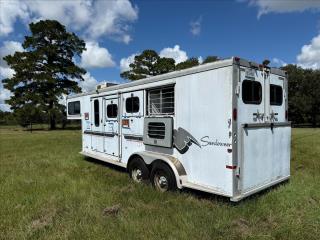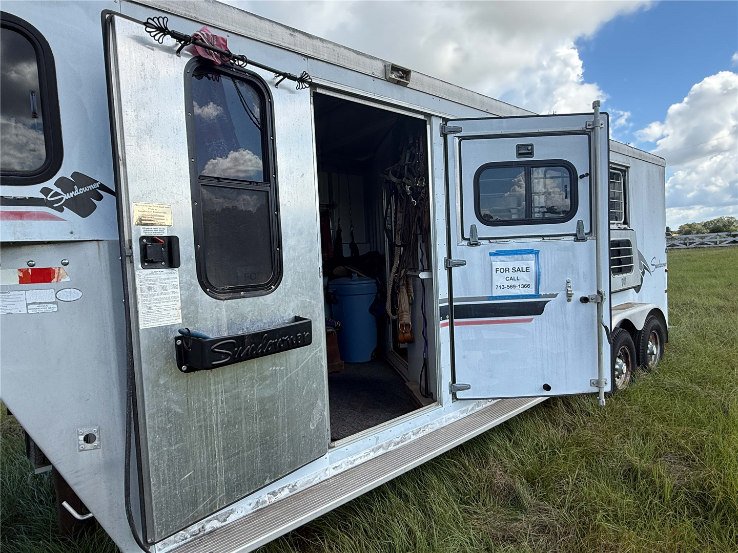 1999 Sundowner Valuelite - original owner. Added a hydraulic jack, extra large dressing room with a/c, 3.5 ft added to dressing room upgrade, loading light, dropdown face guards, drop down feed door in escape, walk through door, stainless nose wrap, 19x53 window, loading ramp is very easy to lift, empty weight #5000, electric brakes. Aluminum steel frame. Back tack and 3 saddles rack. Dressing room has space for 3 saddles rack.