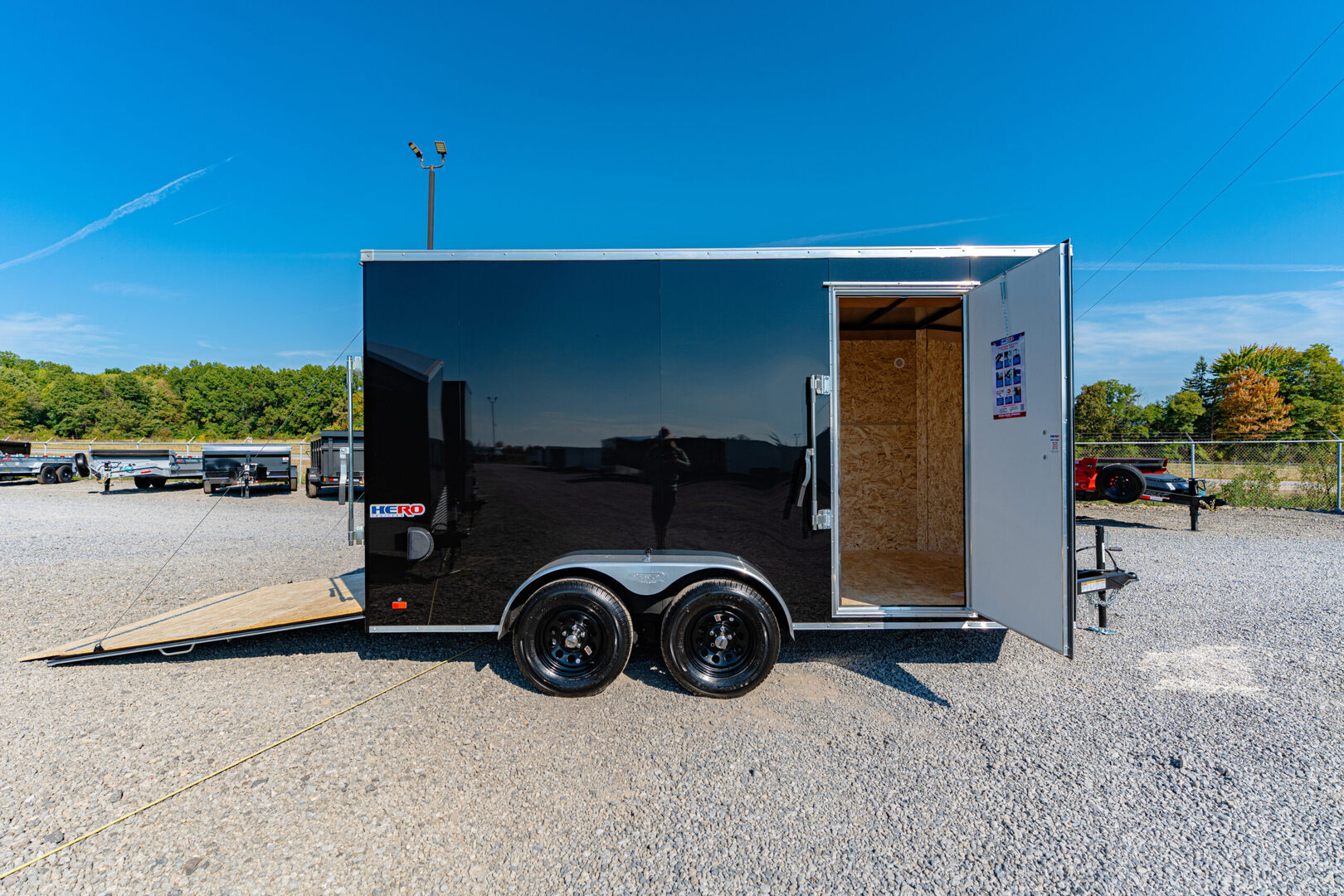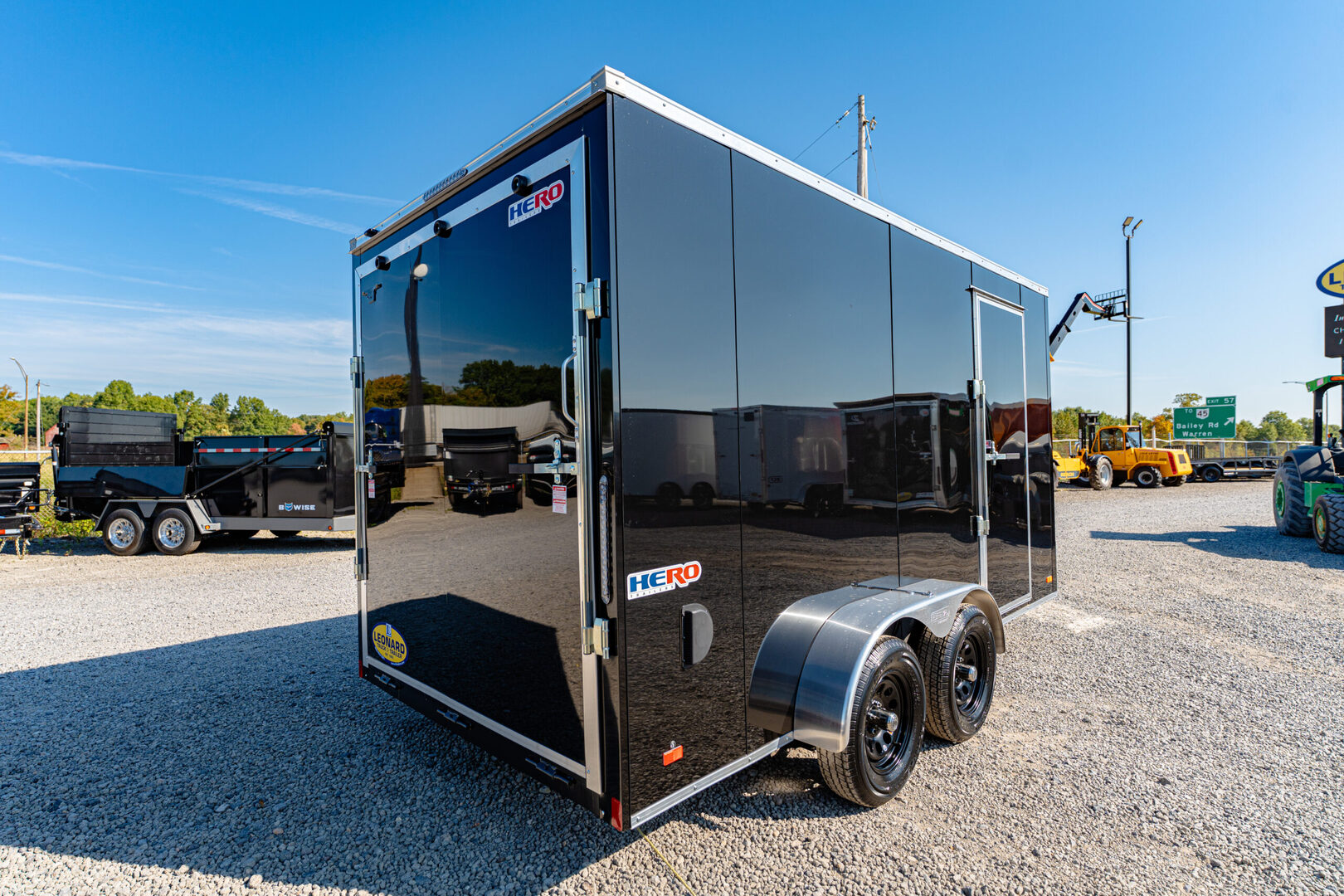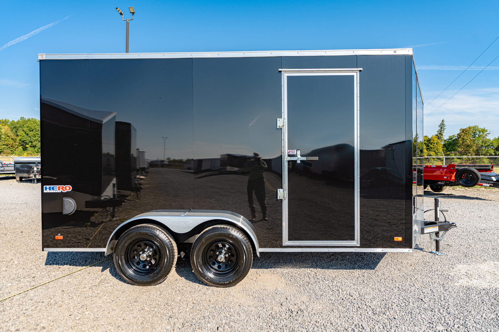Stock# 44974 New 2026 Bravo HR714TA2 Enclosed Cargo Trailer  HERO TRAILERS deliver first class towing at an affordable price. Every Hero Trailer is designed and constructed to give you years of safe, secure and hassle-free towing. Quality features such as .030 aluminum exterior skin over tube wall posts and Dexter EZ ride suspension make for easy, reliable towing. HERO TRAILERS are built better, tow better and will be worth more at trade in time. Model:HR714TA2 Warranty: 3yr-Limited Hero HR714TA2 Enclosed Trailer Chassis & Frame 3500# Tandem Drop Spring Axle Electric Brakes 4” Tube Frame Tube Wall Posts @ 24” O.C. Tube Roof Members @ 24” O.C. Crossmembers @ 24” O.C. 2-5/16” Coupler – 14K Painted Tongue Jack w/ Sand Foot ST205/75R15 LRC 15” Radial Tires Black Mod Wheels Roof & Exterior Aluminum Roof .030 Exterior Metal 5” Screw Pattern 16” Stoneguard BLACK.030 Exterior Metal Lighting LED Strip Tail Lights – Clear Lens Bullet Style LED Clearance Lights Standard ID Light Bar at Rear (2) Dome Lights (Centered @ 4’ & 10’ Back) (1) 12V Switch at C/S Door Interior & Construction 3/8” Engineered Sidewalls 3/4” Engineered Flooring Medium Duty Ramp Door w/ Flap 32” C/S Side Door w/ Barlock (2’ Back, No Flushlock) Vents (1) Pair ABS Flow-Thru Sidewall Vents Front R/S High Rear C/S Low Upgrades & Options 30” Slant Wedge V Nose (HR 7W or 8.5W) ILO 30” V HR 6” Extra Height for .030 Metal (7’ or 8.5’W only)   We offer outstanding financing options, accept trades, and can arrange nationwide NO HASSLE delivery! Inquire today for more information! (888) 333-6613 **We believe these specifications to be accurate. Any discrepancies are unintentional. Please verify information with a sales associate prior to purchase.** Stock Number:44974