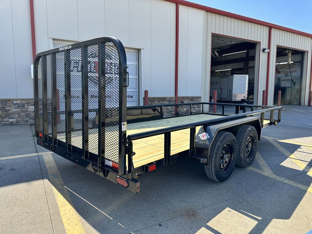83 in x 16ft Pipe Top Utility w/ Slide in Ramps 2 x 3,500lb. Axles (Brakes on Rear Axle) 2 in Ram Coupler Treated Wood Floor 7K Drop Leg Jack ST205 75 R15 (Radials on Black Mod Wheels) Slide in Ramps LED Lights Front Spare Tire Mount Stake Pockets 4 in Channel Tongue   Empty Weight 1,650 lb. G.V.W.R. 7,000 lb. Carrying Capacity 5,350 lb.