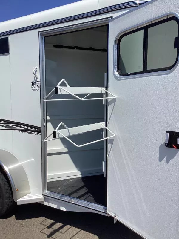 Upgrades: Spare Tire Extra Foot of Length of Trailer Extra Divider Catch Rear Flood Light w/Toggle Switch Trailer Features: 7’ Tall Inside Height 13’ 3” Trailer Body Length 16’ 4”Overall Length Empty Weight 2975# Hitch Weight 375# Payload Capacity 4025# 6” Roof Radius 82” Outside Width 102” Overall Width (including fenders) Electro-Galvanized Sheet Metal Epoxy Primer & PPG Polyurethane Paint Aluminum Diamond Plate Gravel Guard Rubber Dock Bumper Smooth Aluminum Fenders Smaller Aluminum Step Plates LED Lights 4 Wheel Electric Brakes Silver Modual Radial Tire Horse Area: Sealed and Enclosed Diagonal Wall Telescoping Padded Dividers Double Wall Construction Single Enclosed Rear Door Head & Kick Wall Mats 30” x 24” Drop Down Feed Door Windows Head Side Plexiglas Kickside Rubber Floor Mats Tack Room: 5 Bridal Hooks 2 Blanket Bars Swing-Out Saddle Tree Caulk Package Floor Mats ** Descriptions Subject to Error** For more information on this trailer please contact Double J Trailers at 360-225-1234. Thank You! Financing available to qualified buyers! All trailer prices are cash prices. Thank you! Trades Welcome Two Lots To Better Serve You! Woodland Washington & Albany Oregon We have over 250 trailers in stock. Please view our entire inventory at [www.double-j.com](http://www.double-j.com/) thank you! *Double J imposes a surcharge of 3% on credit card purchases of amounts greater than $500*