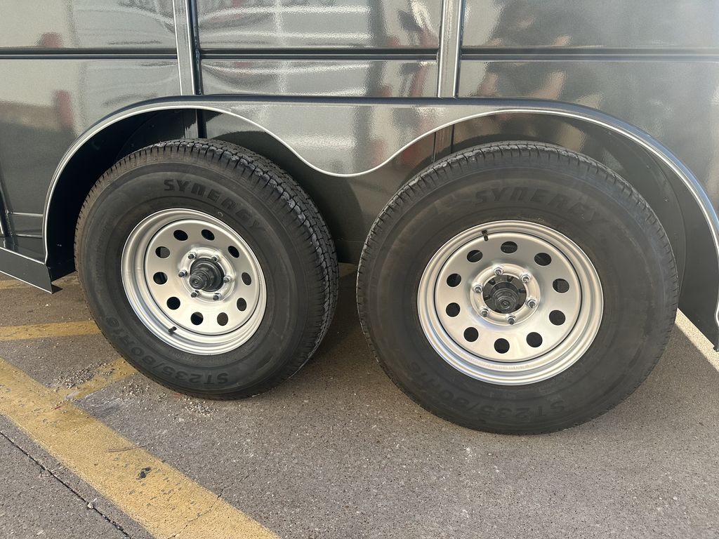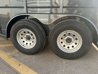 16’ (Length) x 6’ (Width) x 6’ 6 in. (Height) 2 x 3,500 EZ Lube Torsion Axles Brake on Rear Axle ST235 / 80 R 16 in. (Load Range E) SUPER TIRES Max Load Tires 3,520 lb. Each (Total 14,080 lb.) Double Weight Rating On Tires Over Axles 6 Lug Grey Mod Wheels Front Escape Door 2 in. Bulldog Style Coupler 2K Top Wind Jack w/ Caster Wheel Teardrop Fenders w/ Front and Rear Steps ATP Fender Rock Guard 12 in. ATP Front Rock Guard Spare Tire Mount 36 in. Solid Lower Body Center Cross Gate Front Window Steel Rear Bumper 7 Way RV Plug Treated Pine Wood Floors Empty Weight 2,560 lb. G.V.W.R. 7,000 lb. Carrying Capacity 4,440 lb.
