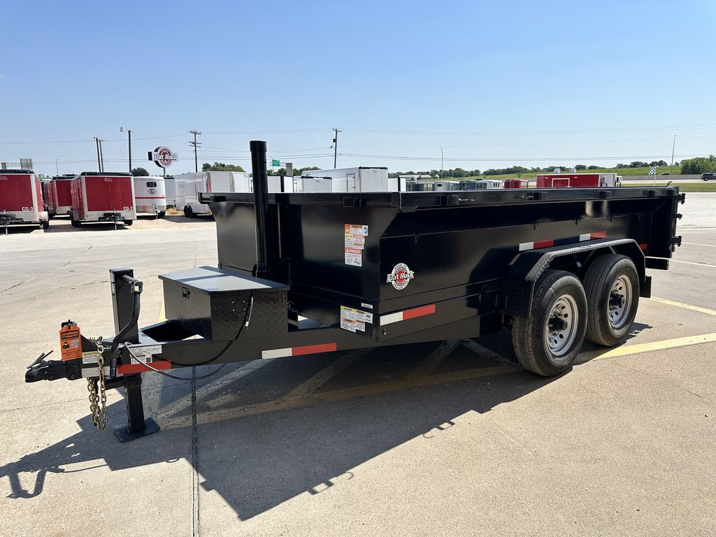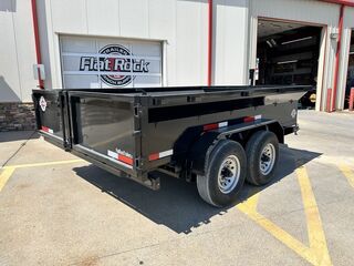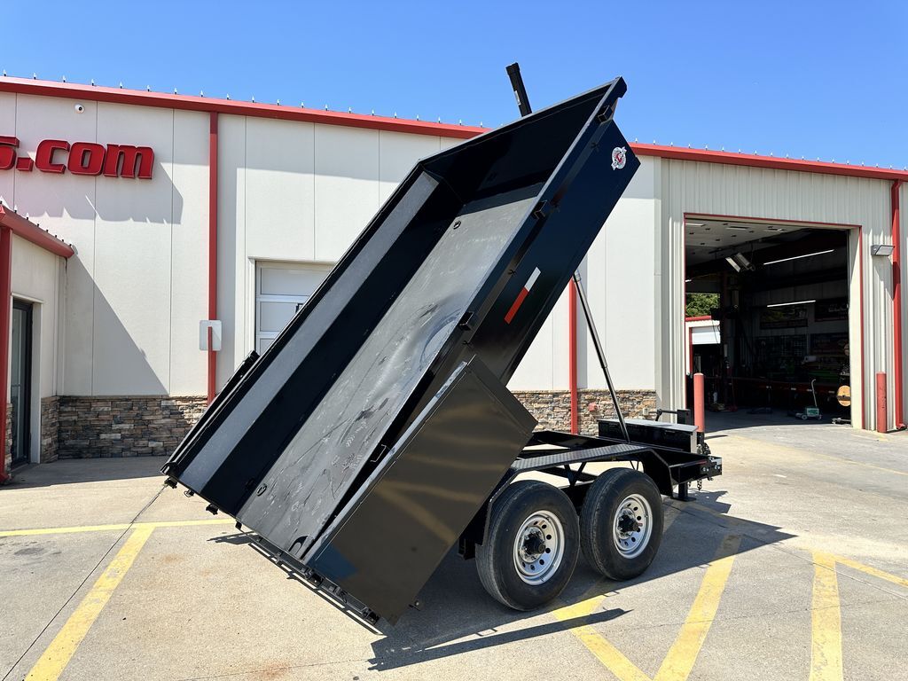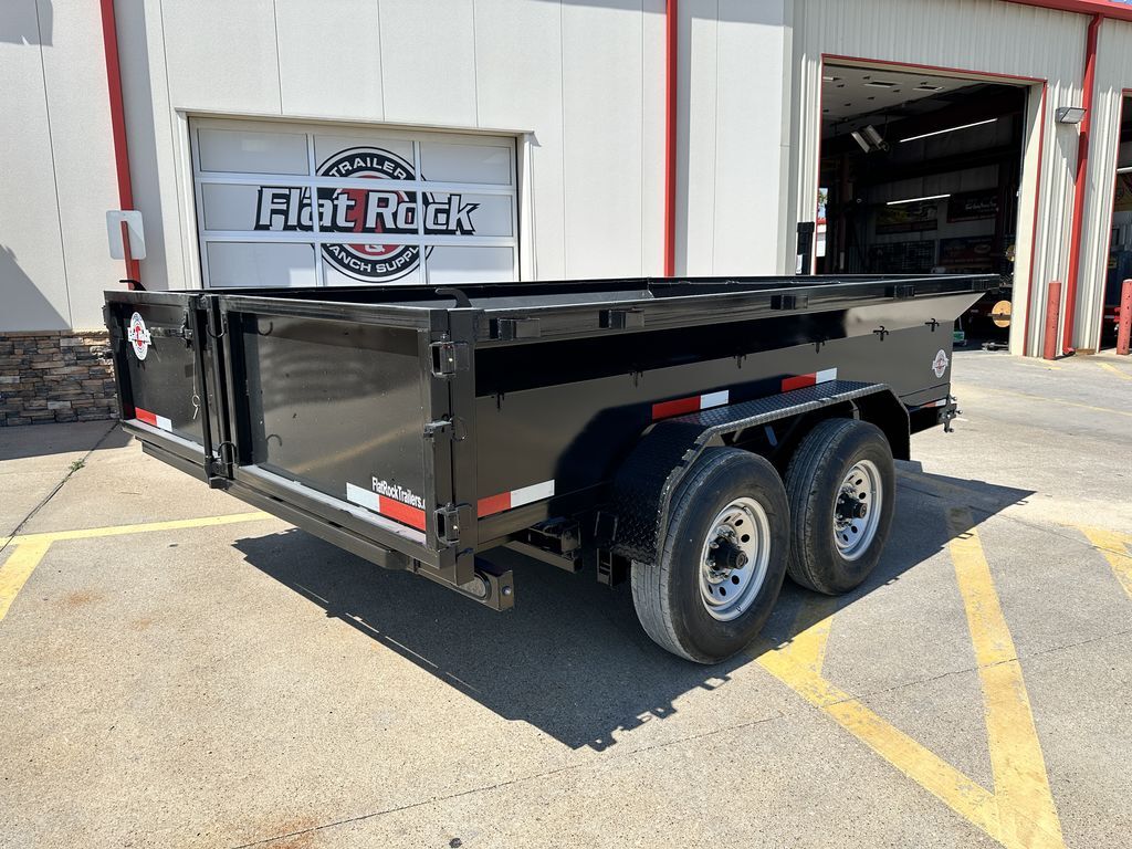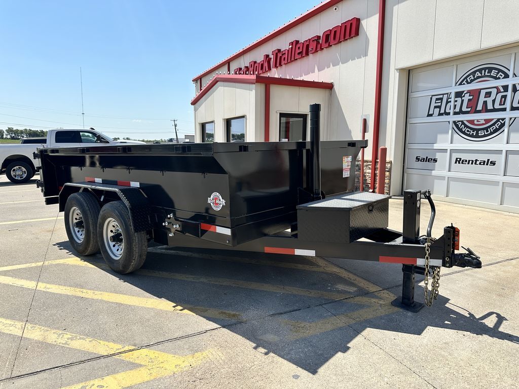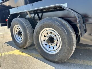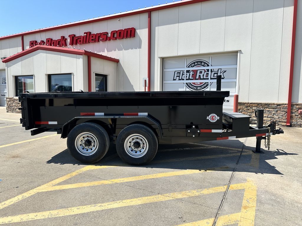 - 7’ x 12’ x 2’ Flare Side Dump Trailer  +/ 6.65 Cubic Yards  - 2 x 7,000 lb. EZ Lube 8 lug (12 in x 2 in brakes on both axles) - Heavy Duty Slipper Spring Suspension - Tires: New ST235/80R16 LRE 10ply radials (3,520 lb.) - Main Frame: Full Side 6 in x 2 in x 3/16 in Heavy Wall Tube With 6 in Channel (Front and Back) - Wrapped Tongue: 6 in Channel - Tilt Frame: 3 in x 2 in x 3/16 in Heavy Wall Tubing - Spare Tire Mount  - Cross Members: 3 in Channel - Bed Flooring and Siding: 1/8 in Steel  - Deck width: 82 in - Deck Length: 12’  - Deck Height: Approximately 28 in - Side Wall Height: 24 in - Rear Doors: Double Swing Doors (open like barn doors) - Battery: Group 24 Deep Cycle Marine - Controller: 15’ corded remote control - Toolbox: Front locking toolbox contains battery and pump - Hydraulics: Single 3 stage hydraulic cylinder (14,000 lb.) - Coupler: 4 hole adjustable height 2 5/16 in ball - Safety Chains: Two heavy duty safety chains - 12,000 lb. Drop Leg Jack - Fenders: 14ga heavy duty tread plate - Lighting: All flush mount or recessed lifetime LED  - DOT required emergency break a way kit and conspicuity tape  - Finish: Primed / painted with 2 coats of auto. grade acrylic enamel    - Empty Weight  3,500 lb. - G.V.W.R.  14,000 lb. - Carrying Capacity   10,500 lb.