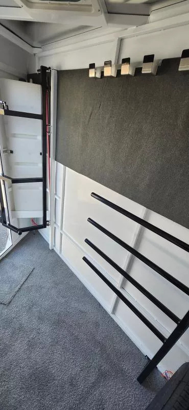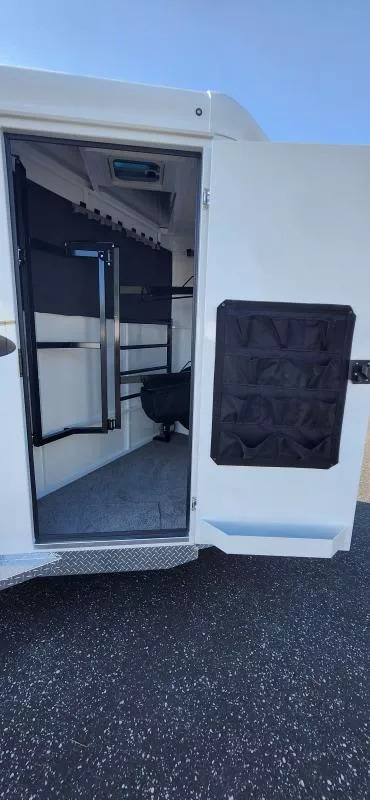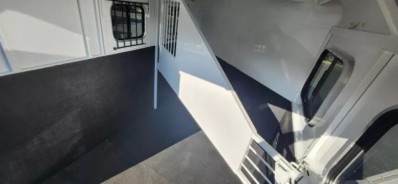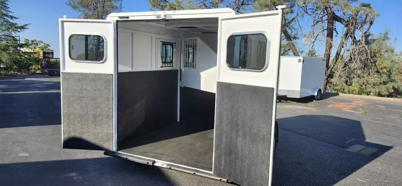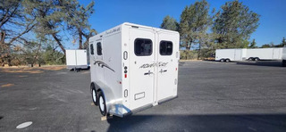 This trailer has never been used, just driven from the lot to the enclosed storage facility then back to us. Features: Fully enclosed horse compartment with drop-down feed windows, tail side sliding windows swing out saddle rack carpeted tack water tank blanket rack