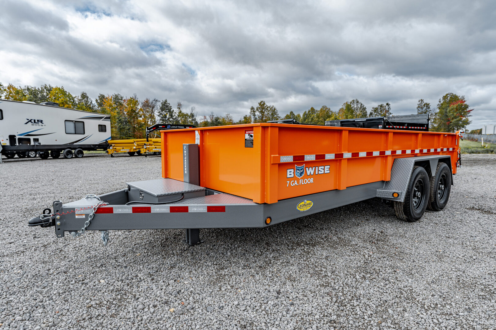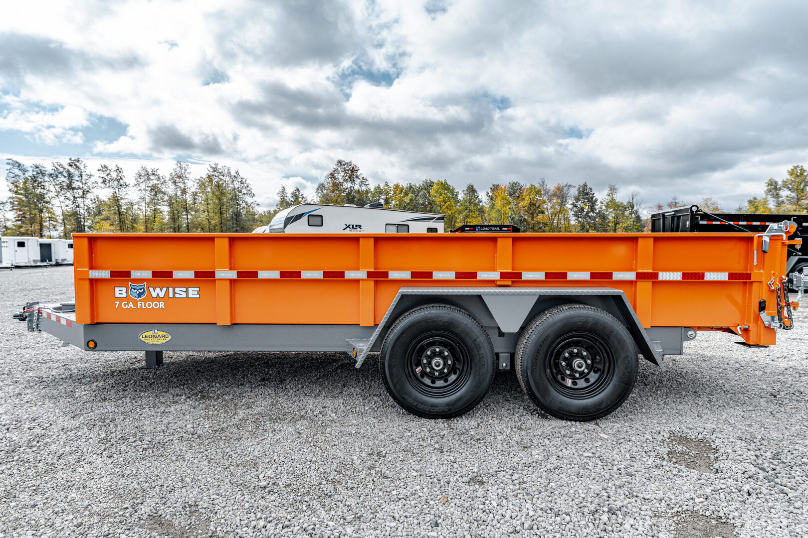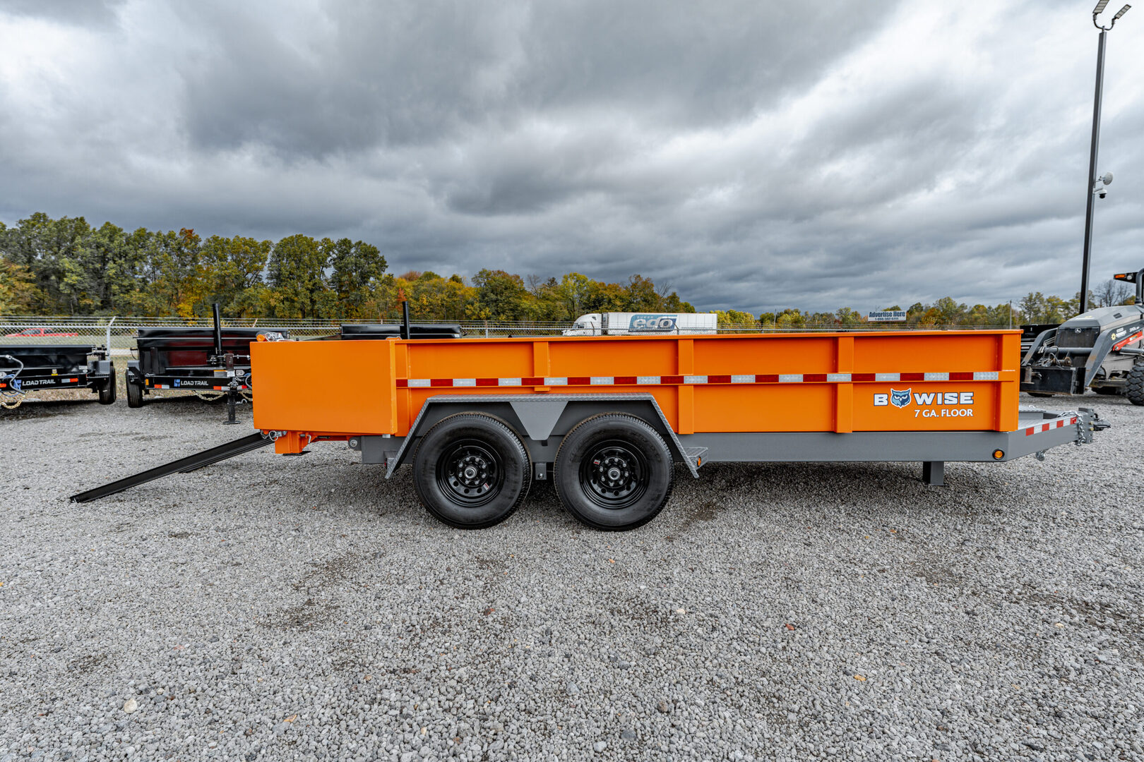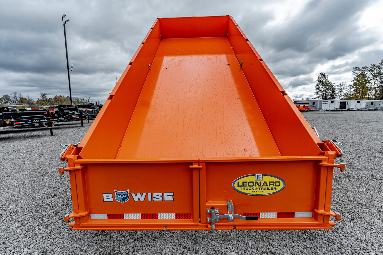 Stock# 45037 New 2026 Bwise DLP16-15 Dump Trailer The DT Channel Frame Low Profile Dump Trailers are the go-to low profile dump models for your homeowner and light duty commercial projects. With standard features to keep your dump trailer hauling projects moving easy and efficiently. Model:DLP16-15 Warranty: 2yr- Structural DLP15 – DLP16-15 Dump Trailer (Low Profile) General Color: Orange / H-Tone Gray Frame Model: DLP16-15 Low Profile Dump Dimensions: 82” W x 16’ L GVWR: 15,400 lbs Frame & Coupler Main Frame: 8” tube Coupler: 2-5/16” adjustable coupler Jack: Hydraulic jack Axles & Suspension Axles: (2) 7,000 lb SS tandem axles, electric brakes Tires & Wheels Tires: ST235/80R16E radial, black modular wheels Hydraulics & Battery Cylinder: HD hoist with 5” cylinder Battery: Group 27 deep cycle Battery Charger: Included Body & Tailgate Gate: 3-way combo (gate/ramps/D-rings) Floor: 7GA one-piece floor Sides: 12GA steel sides Additional Features Rear Stabilizer Jacks 7’ Bwise Tarp Kit (Orange)   We offer outstanding financing options, accept trades, and can arrange nationwide NO HASSLE delivery! Inquire today for more information! (888) 333-6613 **We believe these specifications to be accurate. Any discrepancies are unintentional. Please verify information with a sales associate prior to purchase.** Stock Number:45037