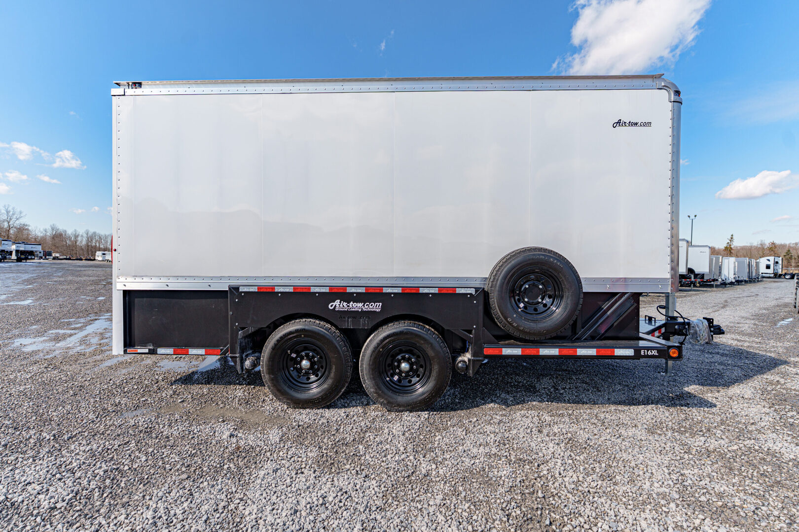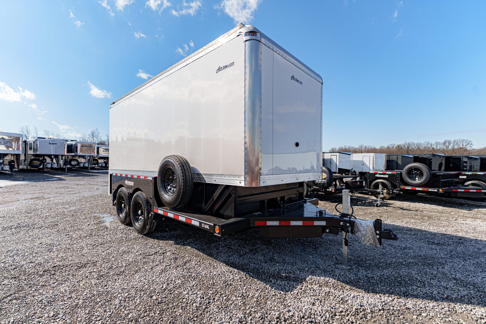 View Inventory: https://leonardtrailers.com/inventory/45061 Stock # 45061 โ€“ 2026 Air-Tow E-16 XL Enclosed XL Trailer Model: Enclosed GVWR: 15,940 lbs. Capacity: 10,000 lbs. Deck Length: 15.9' The Air-Tow E-16 XL is the largest enclosed trailer in the Air-Tow lineup and comes preloaded with premium features. It offers 15'9? of usable deck space and a 10,000 lb. carrying capacity, making it ideal for equipment that needs secure, weather-protected transport. The extended aerodynamic front end adds a 15? shelf and an additional 36 cubic feet of storage, while also reducing air resistance to help improve fuel efficiency. The rear is extended an additional 16?, bringing total enclosed storage space to 838 cubic feet. Standard features that set the E-16 XL apart include a self-locking roll-up door, 3/8? plywood interior lining, and LED interior lighting. This trailer is also highly customizable with options such as E-track, X-track, nose cone, and other accessories. Features & Specifications Rubber suspension Tandem axles with electric brakes 16? wheels Enclosure color: White (standard) Inside width: 75? Inside height: 98? Inside length: 15'10? plus 15? front shelf Door height: 90? Door width: 71? Painted plywood interior E-Track (28? horizontal) on both sides 2 LED interior lights with switch Self-locking roll-up rear door 6-amp battery charger (mounted, plugs into 110V outlet) 16? spare tire bracket assembly Custom powder coat: Black 16? black steel wheel tandem assembly We offer outstanding financing options, accept trades, and can arrange nationwide NO HASSLE delivery. Inquire today for more information: (888) 333-6613 We believe these specifications to be accurate. Any discrepancies are unintentional. Please verify information with a sales associate prior to purchase. Stock Number:45061