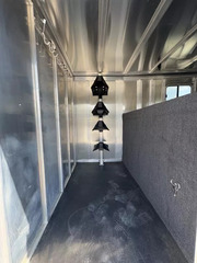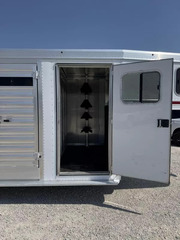 Dressing Room - Digital keypad lock, 48” Short wall, Camper style entry door with sliding window, LED light, 5’ Clothes bar, adjustable bridle hooks, 4 tier removeable & adjustable saddle rack, carpet on drop wall and nose, two windows in nose, rubber floor mats.