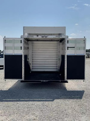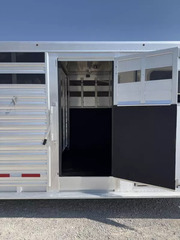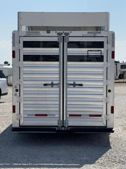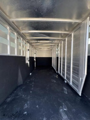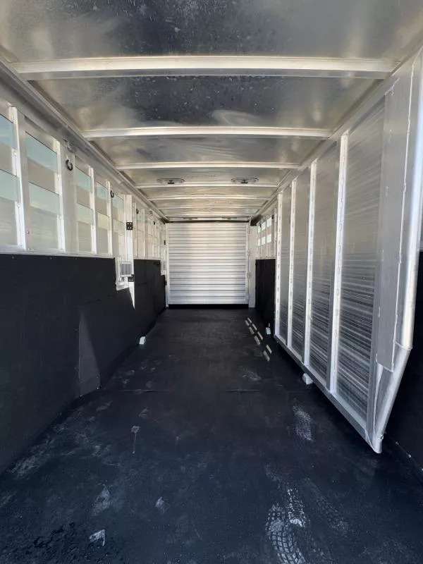 Stock area features - Rubber floor mats, Double rear doors with air spaces and removeable plexiglass, forward escape door, air spaces x2 on all sides with removeable plexiglass, 2 cut gates, 6 pop up roof vents, 14 tie rings, LED load lights, 48” kick pads.