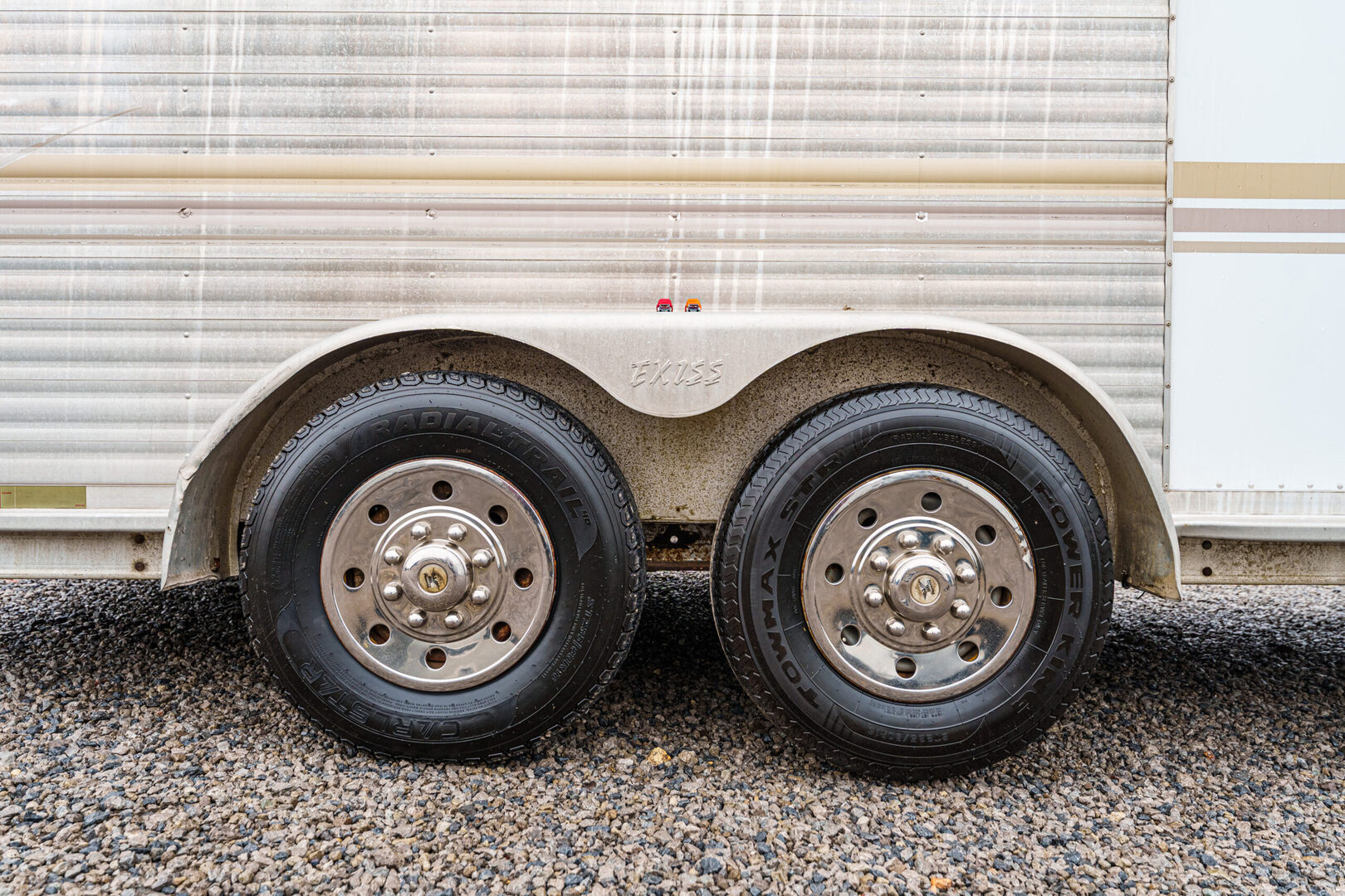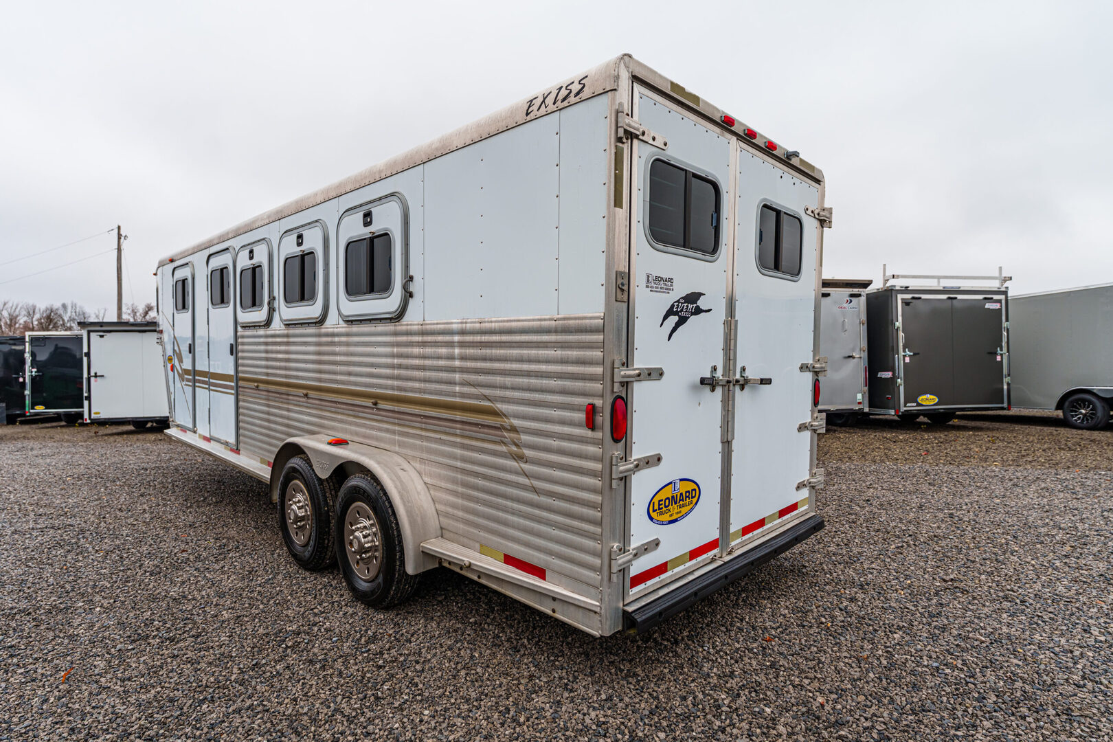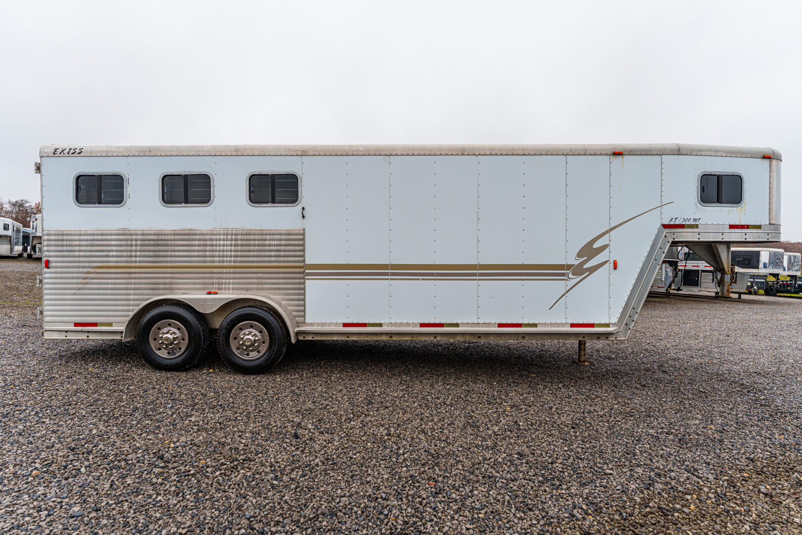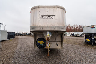 View Inventory: https://leonardtrailers.com/inventory/45075 Stock# 45075 Used 2002 EXISS 3 Horse GN Trailer    General Information Construction: Steel frame with aluminum skin Coupler Size: 2 5/16” Roof: Aluminum Primary Color: White Stripe Color: Gold Length: 40’ Width: 8’ Height: 7’ Horse Area Type: Slant Rubber Lining: Complete Escape Type: 1 Full Walk Out Tack Area Type: Rear Collapsible, Inside Dress Dressing Room Size: 10’ Type: Slant Options: Lined/Insulated  Carpet  110V Package  Options: Camper Steps  Air Conditioning Furnace / Heat Strip  Sofa  Dinette  Sink / Kitchen  Stove / Refrigerator  Microwave / Oven  Sink in Bath  Toilet / Shower  Specifications GVW: 14,000 lbs Axle Size: 5,200 lbs Tire Size: 235/80R16 # of Brakes: 4 Brakes: Electric Ride Type: Rubber Ride Jacks: Single Hydraulic We offer outstanding financing options, accept trades, and can arrange nationwide NO HASSLE delivery! Inquire today for more information! (888) 333-6613 **We believe these specifications to be accurate. Any discrepancies are unintentional. Please verify information with a sales associate prior to purchase.** Stock Number:45075