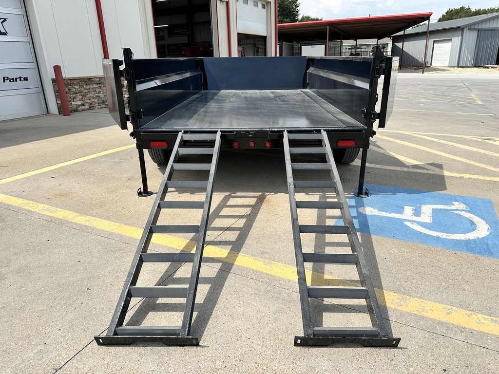 83 in x 14’ Tandem Axle Bumper Pull Dump Trailer 2 x 7,000 lb. EZ Lube Lippert Brake Axles 24 in Solid Sides 8 in I Beam Formed Tongue / Frame 2 5/16 in Adjustable Demco Coupler (21K) 12K Drop Leg Jack Front Side Steps Tarp Included w/ Full Formed Shroud and Anti Sail Bar ST 235 80 R16 in Load Range E Radials Lockable Pump and Battery Box (Double Sized) Fully Self Contained 5 STAGE TELESCOPING / MEGA HOIST Power Up & Gravity Down Built In 110V 5 Amp Charger Combo Rear Gate H/D Spare Tire Mount (Mount Only) 6’ Slide in Ramps on Rear LED Protected Recessed Lights 6 Stake Pockets (Sides and Front) 7 GAUGE STEEL FLOOR All Weather 7 Way RV Plug Empty Weight: 4,036 lbs. GVWR: 15,400 lbs. Carrying Capacity: 11,364 lbs.