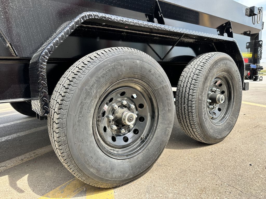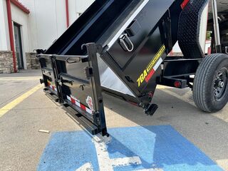 83 in x 14’ Tandem Axle Bumper Pull Dump Trailer 2 x 7,000 lb. EZ Lube Lippert Brake Axles 24 in Solid Sides 8 in I Beam Formed Tongue / Frame 2 5/16 in Adjustable Demco Coupler (21K) 12K Drop Leg Jack Front Side Steps Tarp Included w/ Full Formed Shroud and Anti Sail Bar ST 235 80 R16 in Load Range E Radials Lockable Pump and Battery Box (Double Sized) Fully Self Contained 5 STAGE TELESCOPING / MEGA HOIST Power Up & Gravity Down Built In 110V 5 Amp Charger Combo Rear Gate H/D Spare Tire Mount (Mount Only) 6’ Slide in Ramps on Rear LED Protected Recessed Lights 6 Stake Pockets (Sides and Front) 7 GAUGE STEEL FLOOR All Weather 7 Way RV Plug Empty Weight: 4,036 lbs. GVWR: 15,400 lbs. Carrying Capacity: 11,364 lbs.