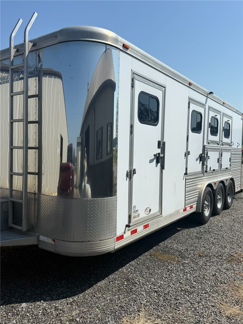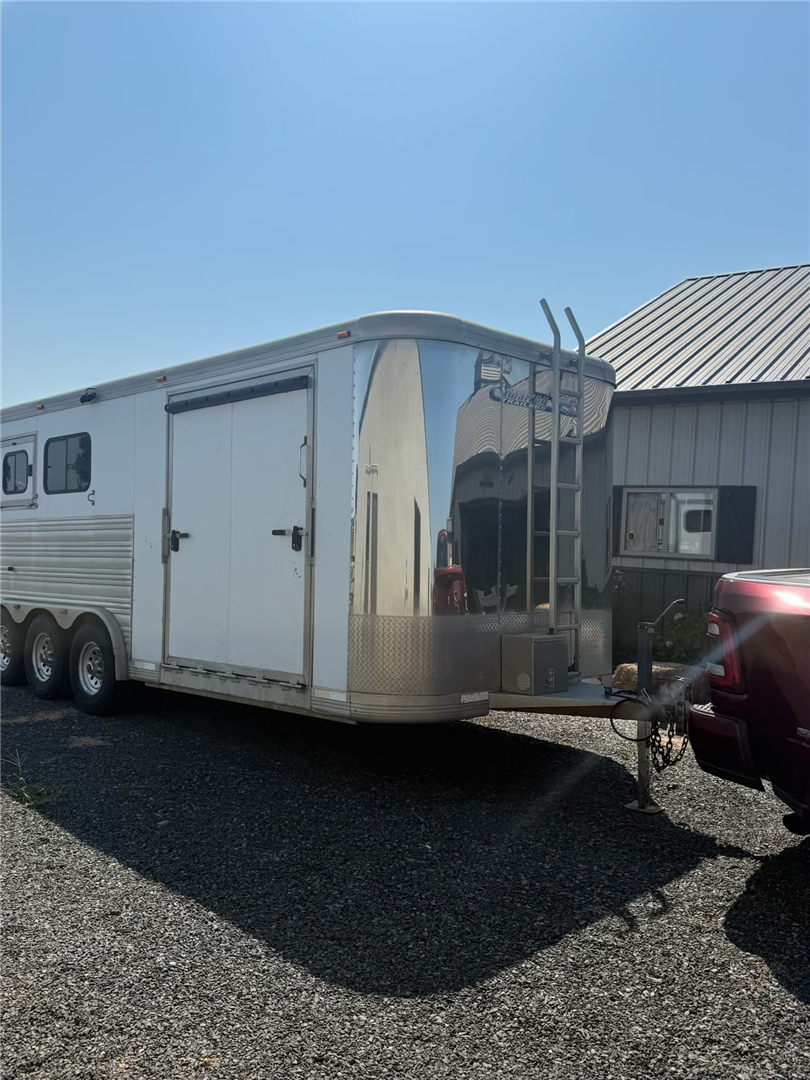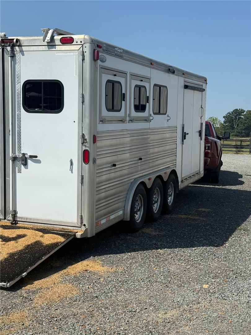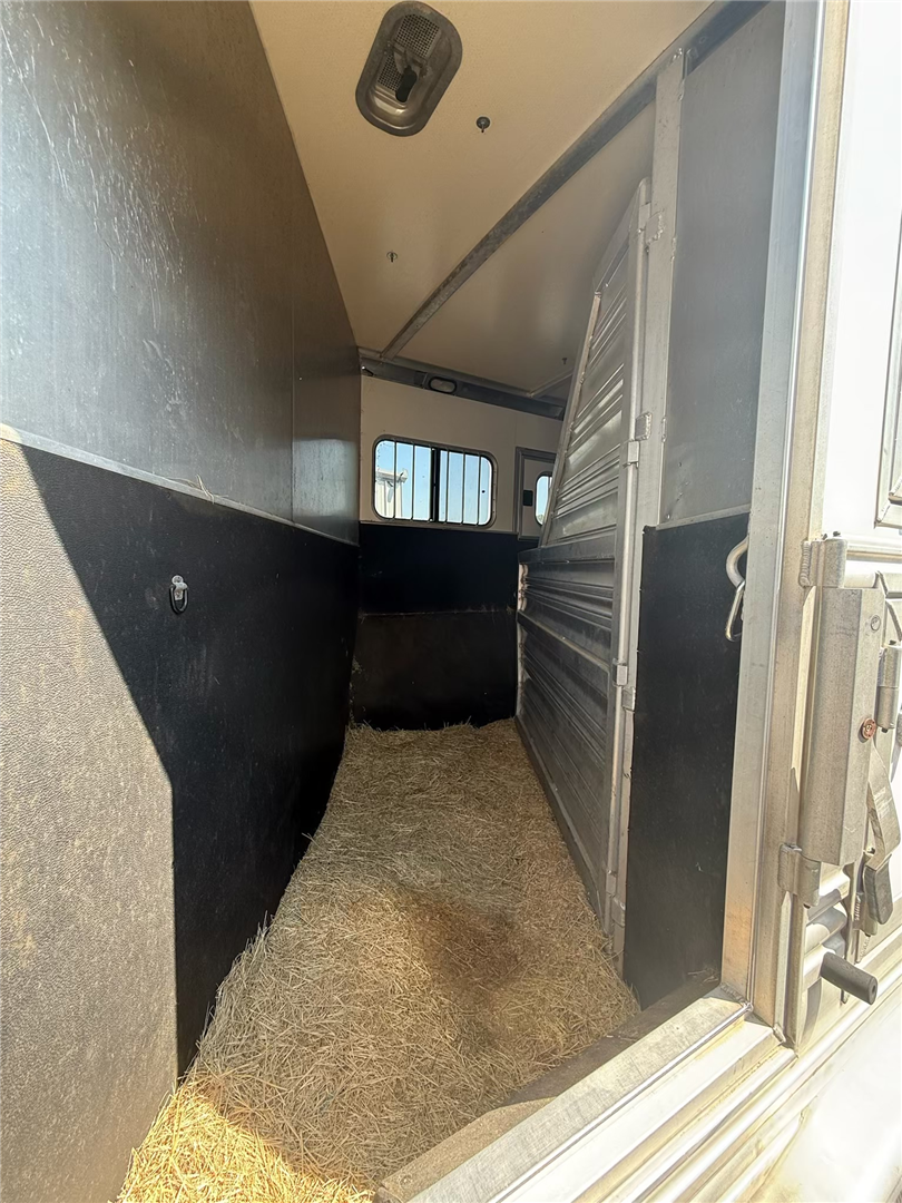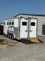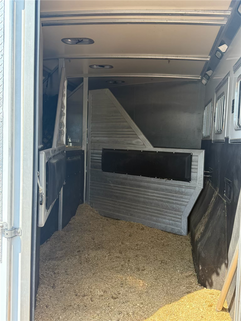 Front stud partition, Mangers, Back tack,Wide Ramp, 8’ wide x 7'-6" tall, Dressing room with walk through door and golf cart ramp. Extra bridle racks and full wall of clothing bar in dressing room. 7'-7" short wall in dressing room. Very Lightly used. Drop doors at head and tail. Remote control Winch system for pleasure driving cart and wheel barrow. 32,000