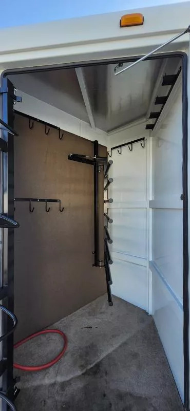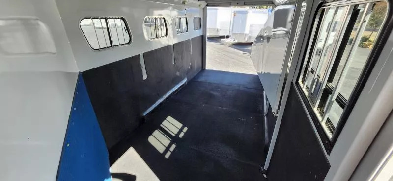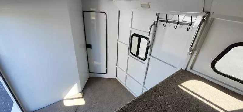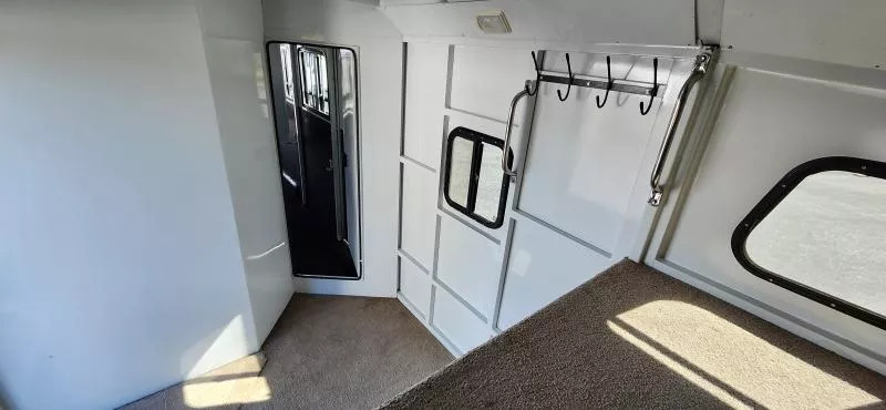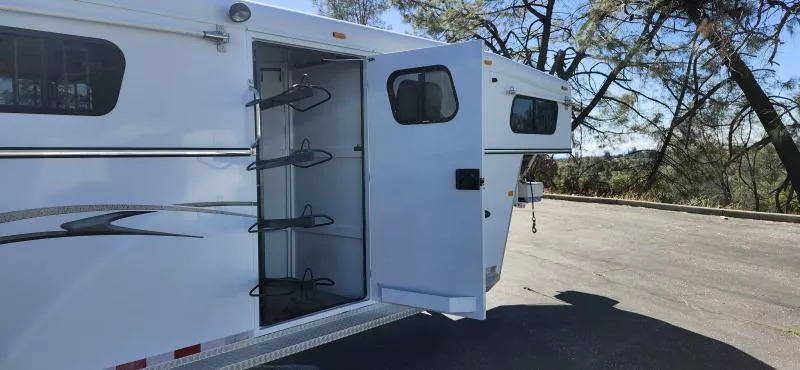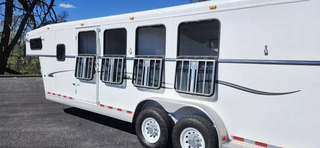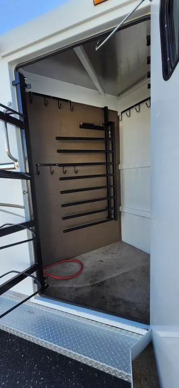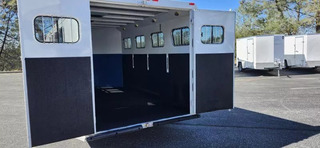 This Trails West Gooseneck 4-Horse Trailer, built for those that demand reliability, comfort, and top-tier functionality. Features: Mid-Tack Bigfoot Hydraulic Jack - Quick, effortless hitching and unhitching at the push of a button. Walk-Through Door - Easy access between the tack room and horse area for added convenience. Escape Door - Enhanced safety and flexibility for loading and unloading. Hensley Gooseneck Air Ride Coupler - Smooth, stable towing that reduces stress on your truck and horses. Fantastic Fan - Superior ventilation to keep your horses cool and comfortable on the road. Whether you’re heading to a show, trail ride, or cross-country haul, this trailer is designed to make every trip smoother and safer for both you and your horses.
