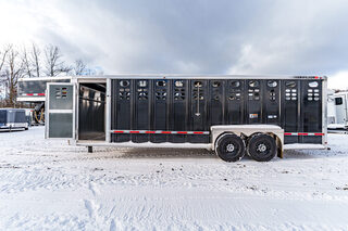 View Inventory: https://leonardtrailers.com/inventory/45094 Stock# 45094 New 2026 Wilson PSGN-5724 Gooseneck Stock Trailer Our most popular gooseneck stock trailer. The Ranch Hand punch style aluminum livestock trailer offers you the same reliable construction as our sales leading livestock semi-trailers in a stock trailer having all the essential features and a convenient but limited list of available options. Choose between natural aluminum sides or opt for the popular black or gun metal sides. Wilson goosenecks are made stronger to endure the toughest of demands, yet remain quieter and easier to pull for a longer period of time. Model: PSGN-5724 Warranty: 3yr- Limited Trailer Specifications Model: PSGN-5724 Ranch Hand Color: Black Length: 24 ft Width: 84 in interior, 7 ft 3 in overall (standard) Height: 6 ft 8 in interior Nose Style: (T) Tapered front Nose Color: Black Coupler: 2-5/16 in adjustable GVWR: 16,000 lb package (A) Axles: (2) 7,000 lb Dexter axles, 102 in wide, 22.5° up (standard) Hubs: E-Z Lube Brakes: Electric Wheels: 6.00 x 16, 8-lug, silver modular (standard) Wheel Coating: Black coating on standard wheels (per each) Tires: ST235/85R16 Carlisle radial trail, 10-ply Tire Carrier: Standard Landing Gear: Standard 12,000 lb drop leg, spring-loaded Roof: Adhesive-attached stretched aluminum (standard) Side Pattern Style: (N) Floor: 0.110 corrugated T.P. w/ 9 in X-bar spacing (per ft) (standard) Nose Floor: Flat aluminum (standard) Running Boards: Full length (standard) Nose Gate Style: (D) Fold down Crowd Gate Style: (A) Full swing (standard) Gate Hardware: Outside release Gate Location: Center of trailer Doors Rear Door Style: (E) Outside slide full swing Rear Door Slam Catch: Standard Side Door: 33 in opening, driver side (standard)   We offer outstanding financing options, accept trades, and can arrange nationwide NO HASSLE delivery! Inquire today for more information! (888) 333-6613 **We believe these specifications to be accurate. Any discrepancies are unintentional. Please verify information with a sales associate prior to purchase.** Stock Number:45094