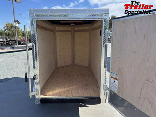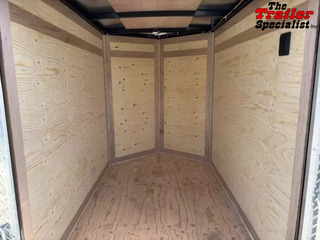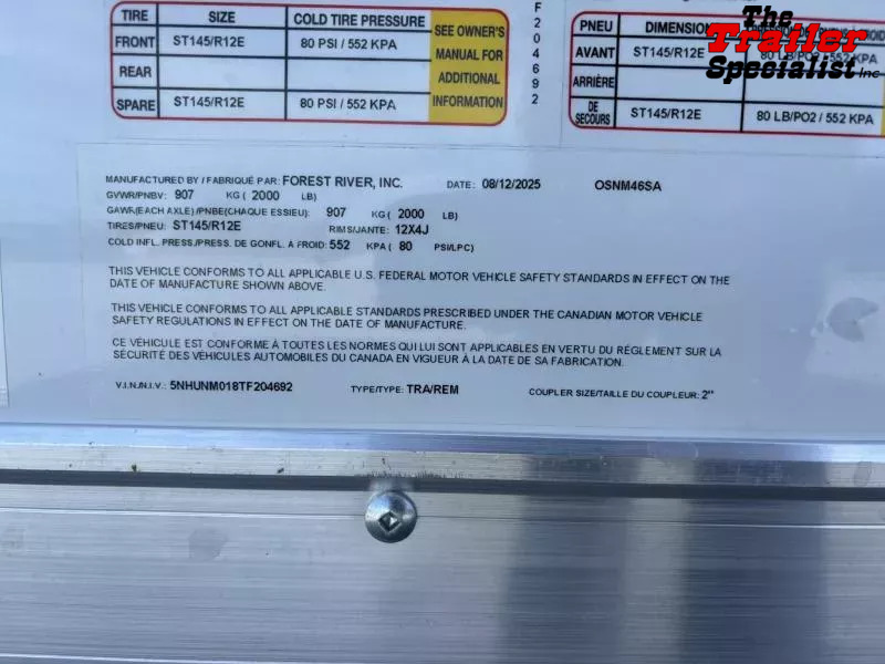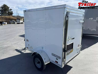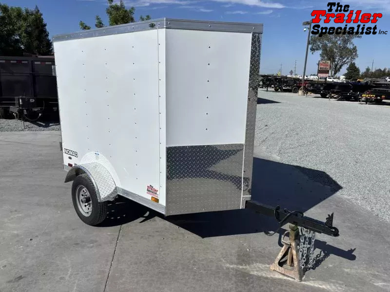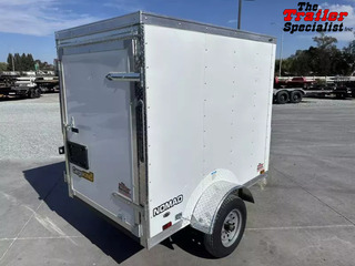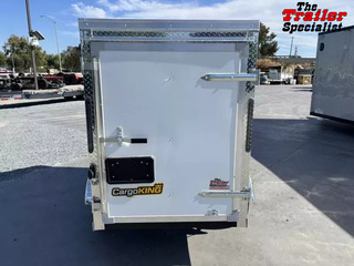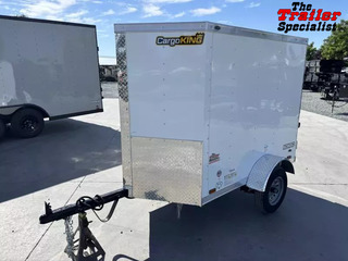 2026 Cargo King NM46SA: 4’ x 6’ Enclosed Cargo Trailer The 2026 Cargo King NM46SA is a compact and efficient enclosed cargo trailer, perfect for light-duty hauling. With a Gross Vehicle Weight Rating (GVWR) of 2,000 lbs, it offers a substantial payload capacity of 1,251 lbs while weighing only 749 lbs, 6” Extra height when empty. This trailer features an 18” wedge-front nose for improved aerodynamics and a range of standard features to ensure reliability and ease of use: * Durable Construction: Built on an undercoated steel frame with an epoxy black finish, this trailer is designed to last. * Doors and Access: Includes double rear doors with a semi-style camlock latch and a door hold-back for convenience. * Wheels and Axles: Rides on a leaf-spring axle with silver powder-coated wheels and radial tires. * Lighting: Equipped with clear lens LED clearance lights, strip tail lights, and a license plate holder with a built-in light. An interior 12V LED dome light is also included. * Exterior: The exterior is .030 white aluminum with an aluminum wrap on the rear, a galvanized roof, and a 16” ATP stoneguard to protect the front. While we always strive for complete accuracy, please confirm specifications with one of our sales reps .