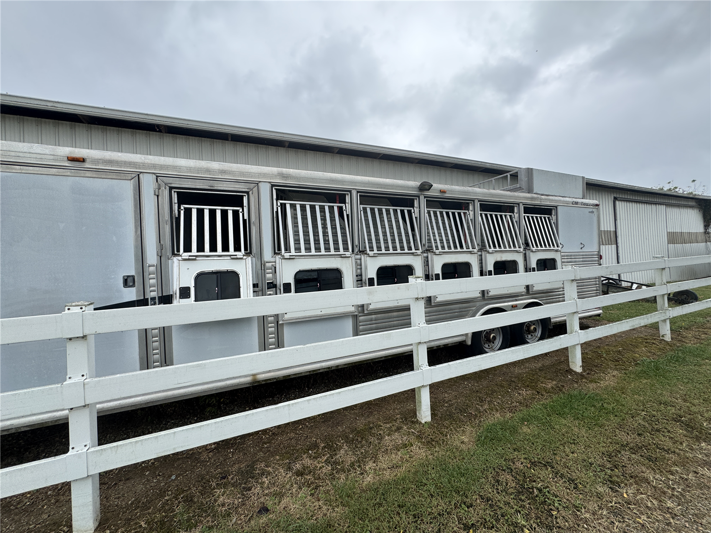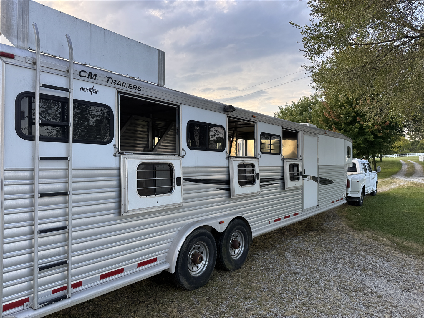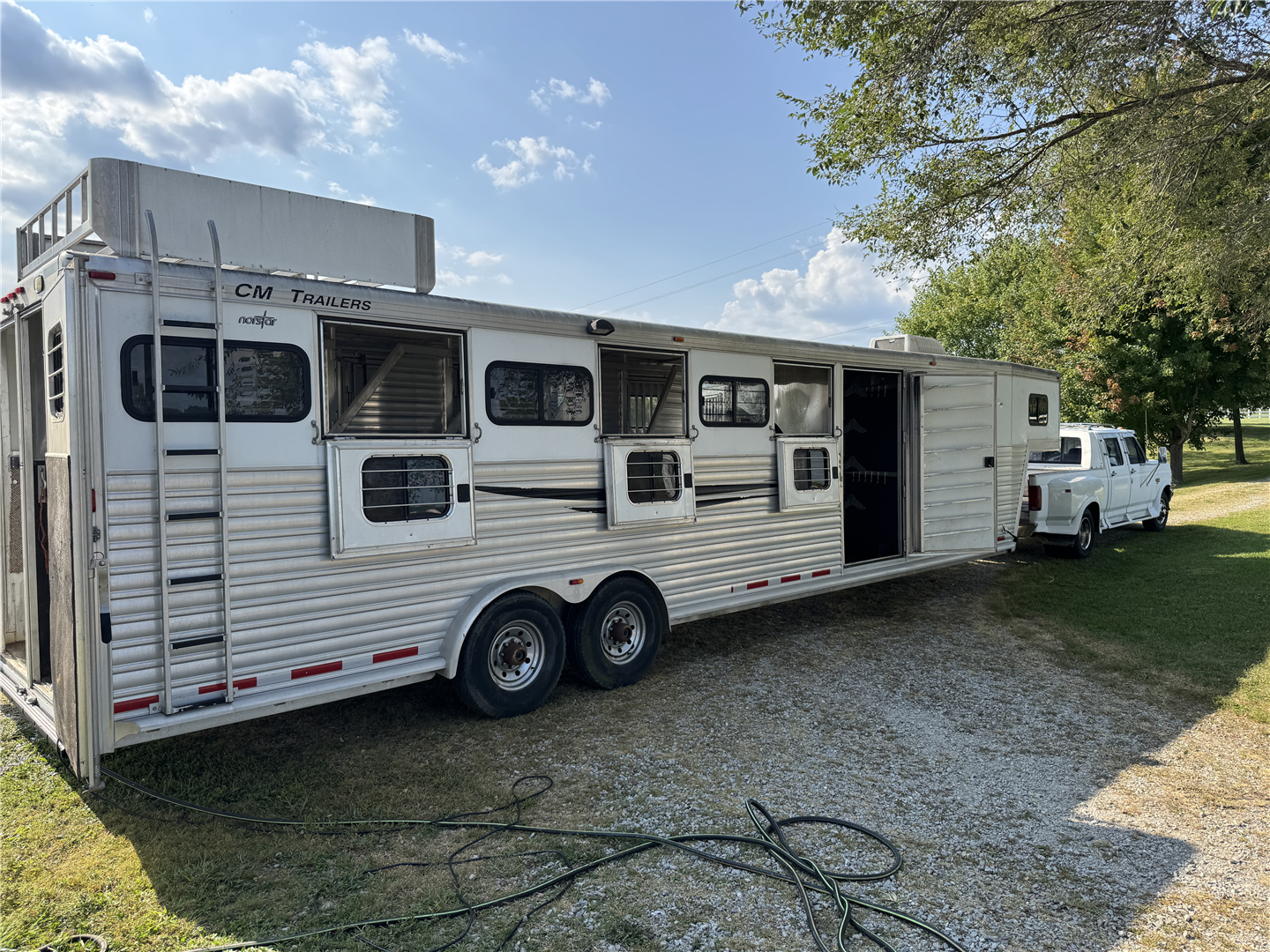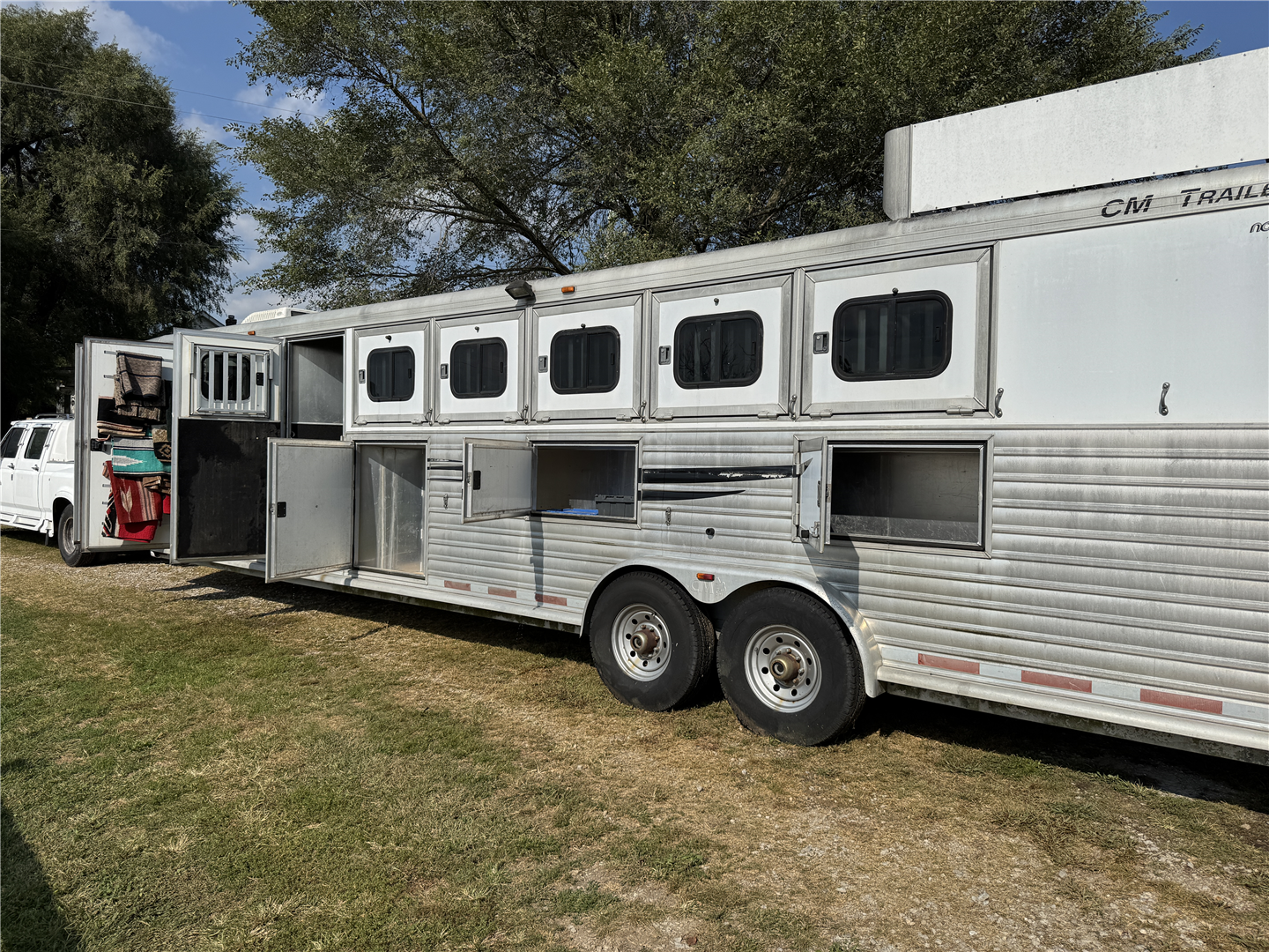 2003 CM Norstar 6 horse slant Gooseneck step up trailer. Aluminum 32' x 7' x 7.1. Excellent Trainer's trailer with tons of storage and tack area. Large Front dressing room with A/C and boot box, clothes rod, hooks etc. 2 mid-tack rooms with saddle racks, bridle hooks, brush box, Rear tack with bridle hooks, Escape door, Full floor mats in great condition and solid dividers. Drop down 6 head windows and 3 rear side windows for great air flow. Full hay mangers. Has under manger large storage compartments outside all long the full manger side. Very good condition. Only hauled a dozen times and has been parked since. A/C only used one time. Tires have good tread, but should be replaced for long hauls due to sitting for awhile.