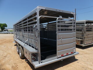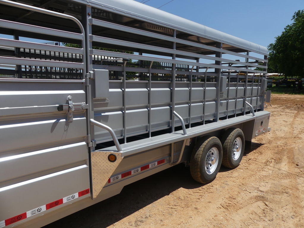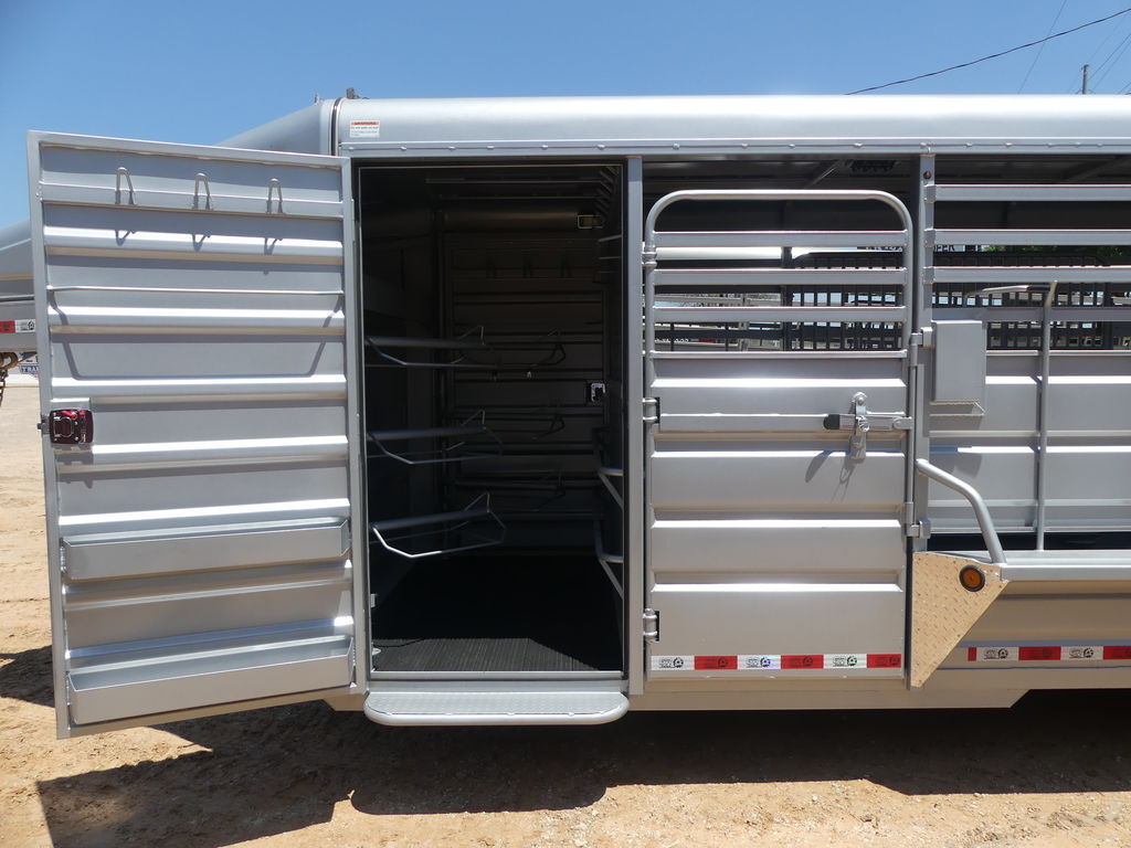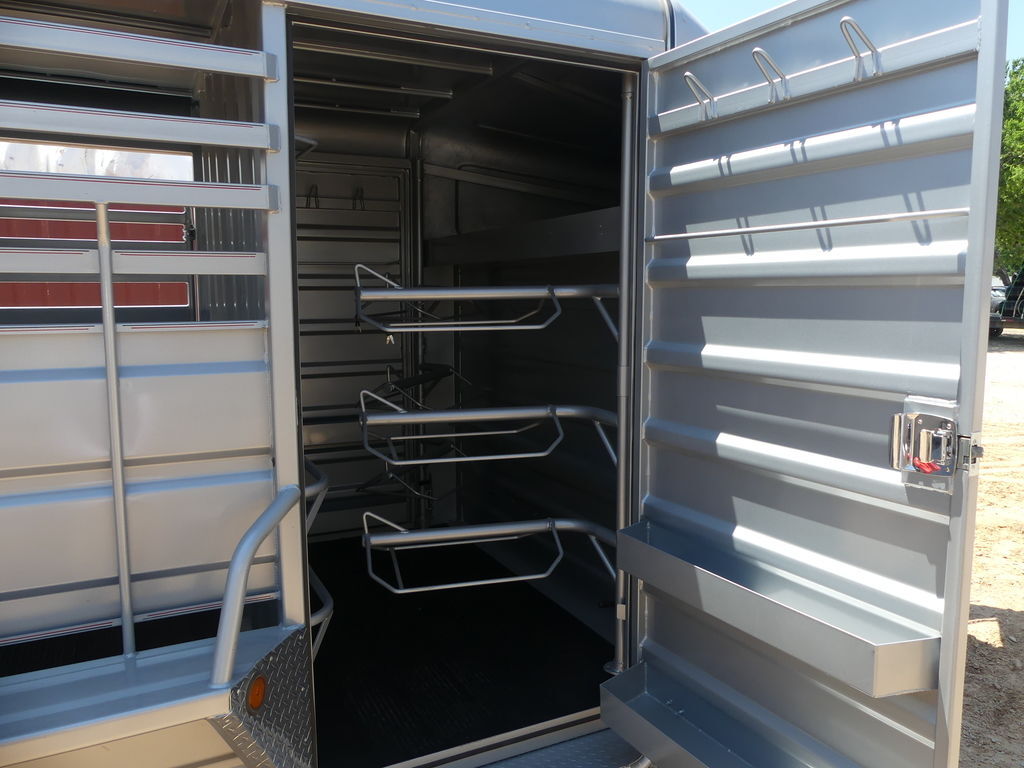 G.V.W.R. 14,000 lbs.G.A.W.R. 7,000 lbs.AXLES Two 7,000 lb Cambered Axles with elec. BrakesSUSPENSION TorsionTIRE 16” (Spare Tire &Wheel Included)WHEEL ST235/80R16 10 PLY (Spare Tire &Wheel Included)COUPLER 2-5/16” Gooseneck Coupler (25,000 lb)SAFETY CHAINS 3/8” Grd. 70 with safety Latch Hook (2 each)JACK 1) 10,000 lb Drop Leg Jack (up to 24’)NECK 8” Channel Riser & NeckFRAME 11 Ga. Sheet Metal with Angle Iron ReinforcementCROSSMEMBERS 2” x 3” Tubing & Angle Iron 3/16” x 2” x 2”SIDES 6” Metal SlatsTOP Aero Nose & Full Metal TopDIVISION GATE 2 GatesREAR GATE Full Swing with Half SliderESCAPE DOOR 36” Side Door (Left Side)FLOOR 2” Treated Pine Lumber DeckLIGHTS D.O.T. Stop, Tail, Turn and Clearance (LED)ELEC. PLUG 7-Way RVFINISH (PREP). Mechanical and/or Chemical Pre-treatment for maximum Paint Adhesion & 1 Coat of PrimerFINISH Painted with two Coats Automotive Quality Acrylic Enamel**46” Solid Sides With 2-1/2” Gap Above the Fender**4’ Straight tack room in Front of Trailer (includes a 3 Tier Swing out Saddle Rack)**Second Door to The Tack Room**(3) extra saddle rack Tier**Smooth Rubber Floor**Escape Door Behind The Tack RoomThe Advertised Prices DO NOT Include: *Licensing* & TaxWe have over 200 trailers to choose from. Come in and see us at:6610 N I-35 Lacy Lakeview, TX 76705 (Exit 342B)Not in the great state of Texas? No Problem! We offer local and nation wide delivery.Store Hours:MON–FRI: 8:00 AM - 5:00 PMSATURDAY: 9:00 AM - 2:00 PMSUNDAY: ClosedRemember we handle all your Trailer Sales & Trailer Part Needs!!!Let us help you with servicing your trailer too!It is our pleasure to serve our community of Waco Texas and all of Central Texas!