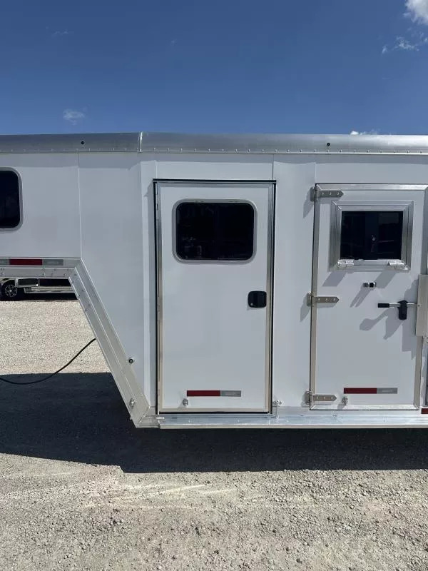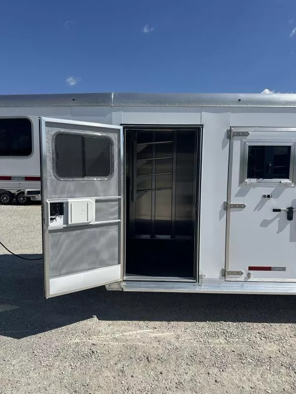 Dressing room - 50” short wall, turf on floor, turf on drop wall and in nose, 5’ long clothes rod, brush box, halter hooks, 3 tier adjustable and interchangeable saddle rack, place for adjustable and interchangeable saddle rack, swing out blanket bars, interior LED lights, camper style entry door, screen door.