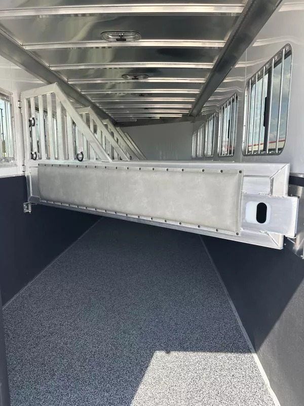 Horse area - EZ Care floor, 48” rubber lined kick walls, lined and insulated to the ceiling, first stall escape door, square drop feed door and drop faceguards on each stall (head), bus windows (hip), Air Flo dividers with pads, first stall hanging partition, pop up roof vents, interior LED lights, inside tie rings, rear folding/removable tack, 3 tier adjustable and interchangeable saddle rack, halter hooks.