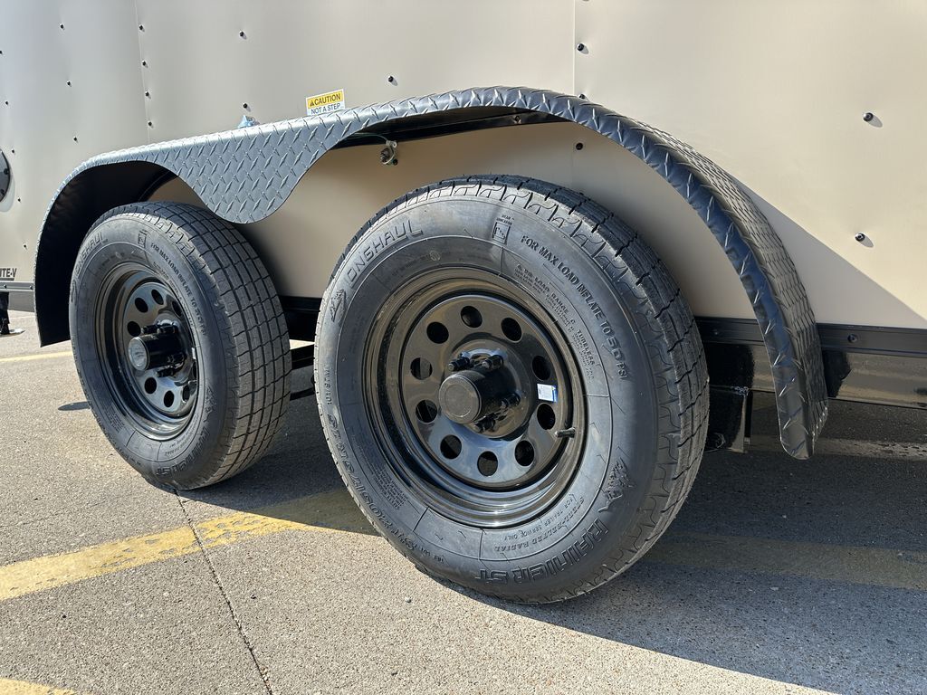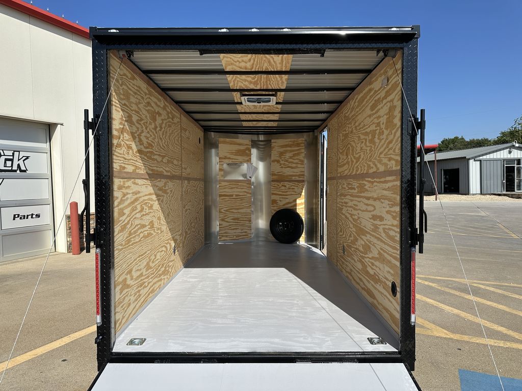 2x 3.5K EZ Lube Brake Axles 4in Drop 16in on Center Cross Members Triple Tongue 2 5/16in Coupler 205 75 R15 Tires on Black Mods 2K Jack Non Powered Roof Vent Stabilizer Jacks Black Out Package 7ft Interior Height Spare Tire Mount Spring Assist Rear Ramp Door 30in Side Door w/ Cam Bar and RV Latch 3/4in Plywood Floor 3/8in Plywood Walls 2 Interior Lights 4 x D Rings Empty Weight 2,000lb G.V.W.R. 7,000lb Carrying Capacity 5,000lb
