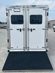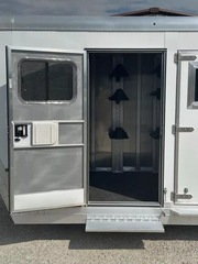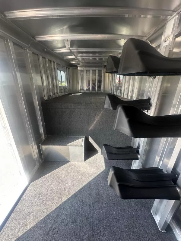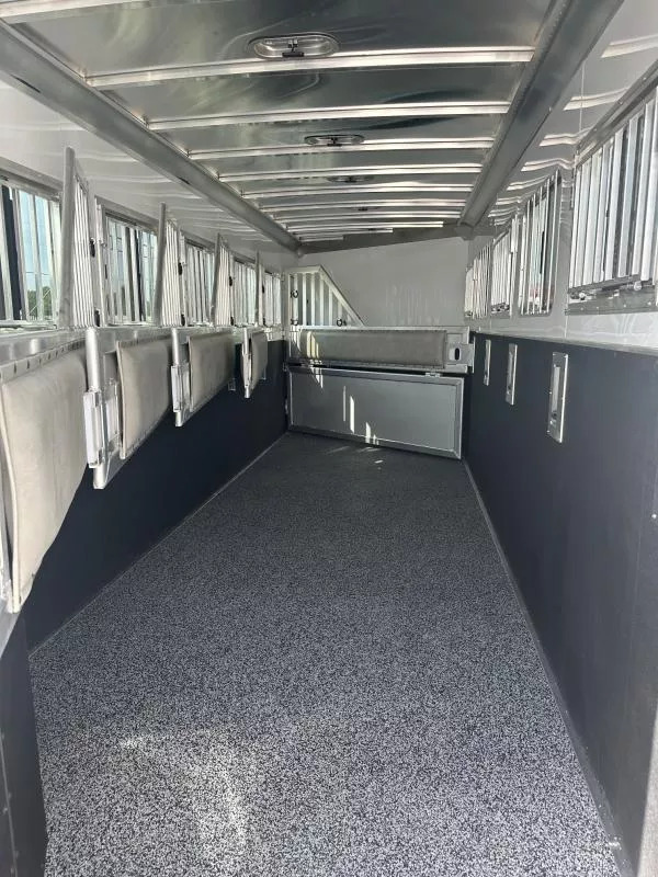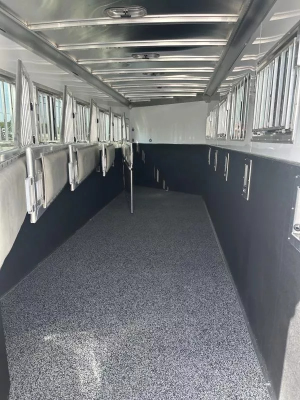 Horse area - EZ Care floor, 48” rubber lined kick pads, lined and insulated to the ceiling, first stall escape door, square drop feed door and drop faceguards on each stall (head), 1st, 3rd and 5th stall drop down windows , 2nd windows with slides and screens (hip), padded air flo dividers, first stall hanging partition, pop up roof vents, interior LED lights, inside tie rings, rear folding/removable tack, halter hooks, rear ramp.