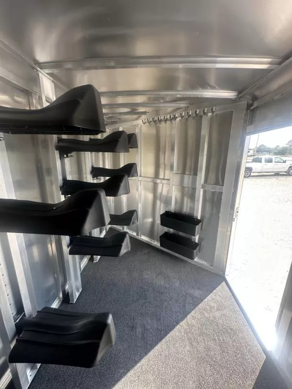 Dressing room - turf on floor, turf on drop wall and in nose, boot box, 5’ long clothes rod, brush box, halter hooks, (3) 3 tier adjustable and interchangeable saddle racks, interior LED lights, camper style entry door, push button lock, screen door, camper door fold down step.