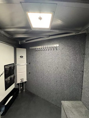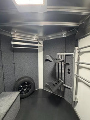 Dressing Room - 2 tier swing out removeable and adjustable saddle rack, 3 tier swing out pad tree, bridle hooks, roof vent, interior LED light, boot box, mirror, pitchfork holder, mounted spare tire, corner water tank, brush tray, door pocket organizer, double doors into dressing room, LED porch light, rubber mats.