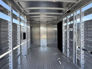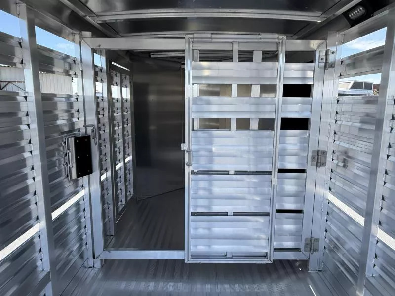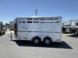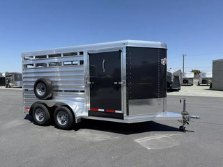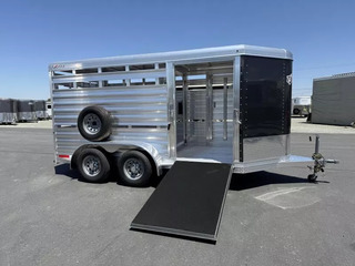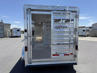2026 Exiss STK613 Express Bumper Pull Stock Trailer. * 6’8” Wide, 13’ Long Box, 6’8”” Tall * All Aluminum Construction * Tandem 3500# Torsion Axles * 15” Radial Tires with 6 Lug Wheels - 8 Ply * 4 Wheel Electric Brakes * One Piece Aluminum Roof * Metallic Black Aluminum Nose Sheets * Treadplate Gravel Guard on Nose * 2” x 4” I Beams on 12” centers * Extruded Aluminum Exterior Slats * Two Air Spaces with Plexiglas Tracks * Additional 2” Lower Air Gap Above Fender * Center Gate with Heavy Duty Slam Latch and External Release * 2 Compartments (One Center Gate) * Extruded interlocking non-skid aluminum floor * 41” Wide Full Height Side Ramp, Curbside * 32” Wide Streetside Unload Door * Full Swing Rear Gate with Easy-Glide Slider with Handle * Rubber Bumper * LED Dome Light with Switch on Rear Frame * Spare Tire with Exterior Mount * 2 5/16” Coupler Call D2 Trailer Sales 209-745-5480 or for more info www.d2trailersales.com