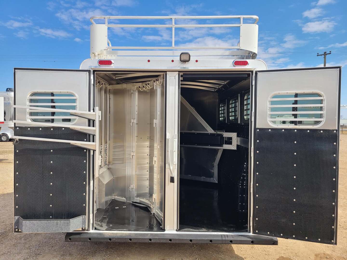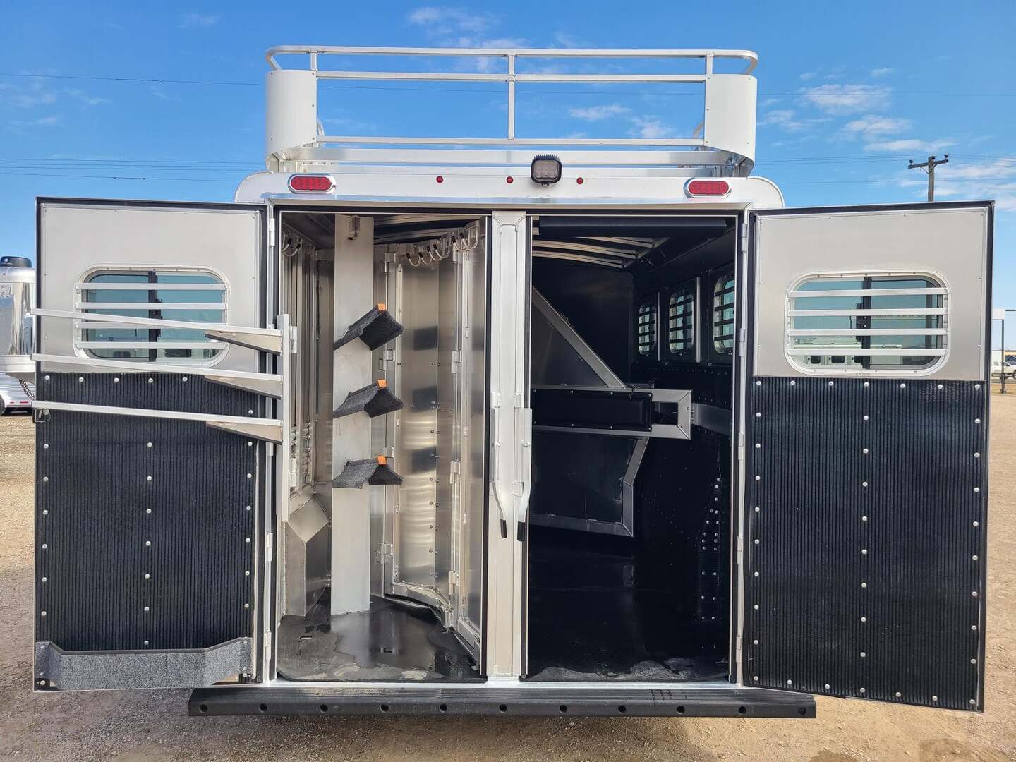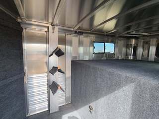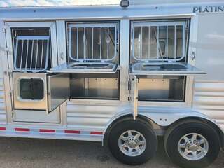 Platinum Coach 3 Horse 4’ Short Wall 7’6” wide x 18’ long x 7 tall Two mangers with escape door on first horse Aluminum mag wheels Drop down windows on curb side Drop down window bars on head side Removable baby panel on first divider Collapsible rear tack with 1x1 post welded to floor to keep tack dry 3 LED load lights Round LED clearance lights 6’ hay rack and ladder Custom graphics package Stainless steel nose 3 tier swing out blanket bar in rear tack Extra location for saddle racks in dressing room 3 saddle racks, can be moved from front to back