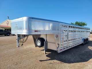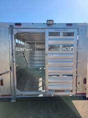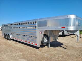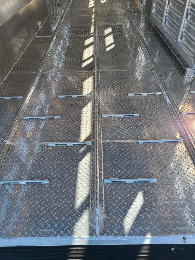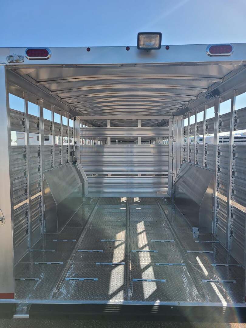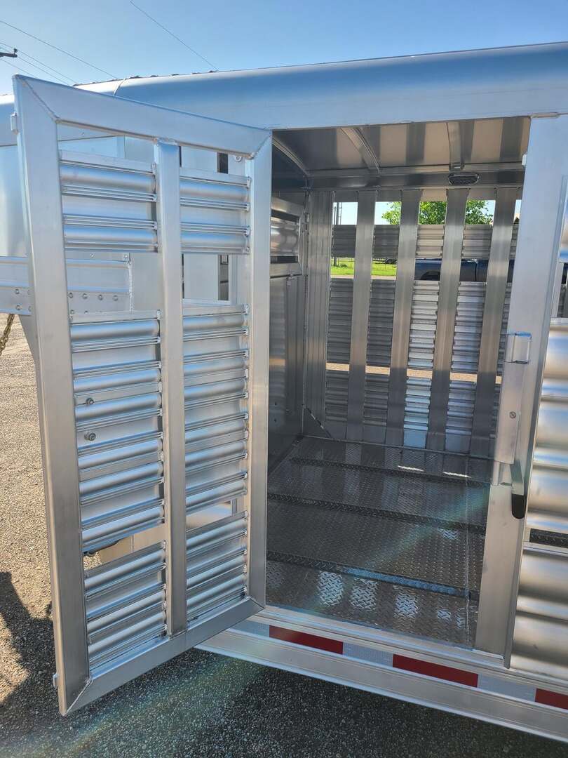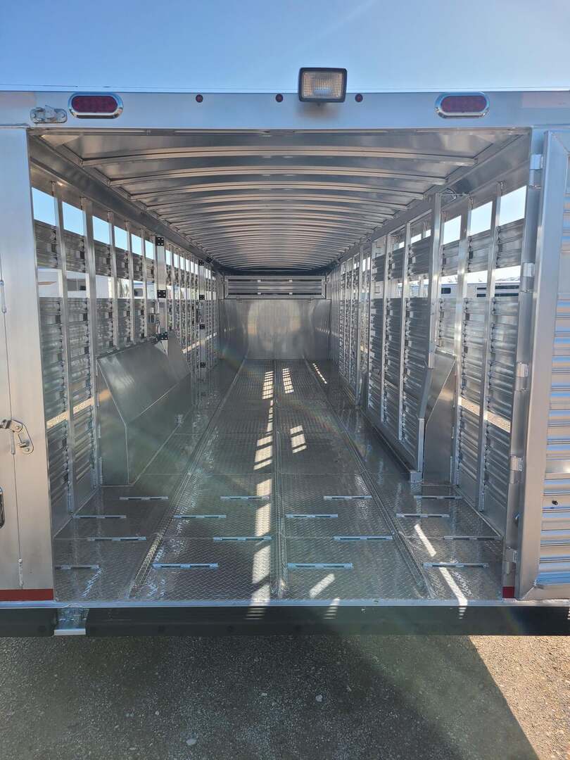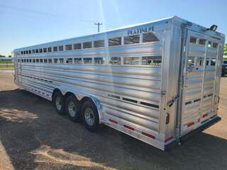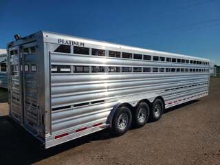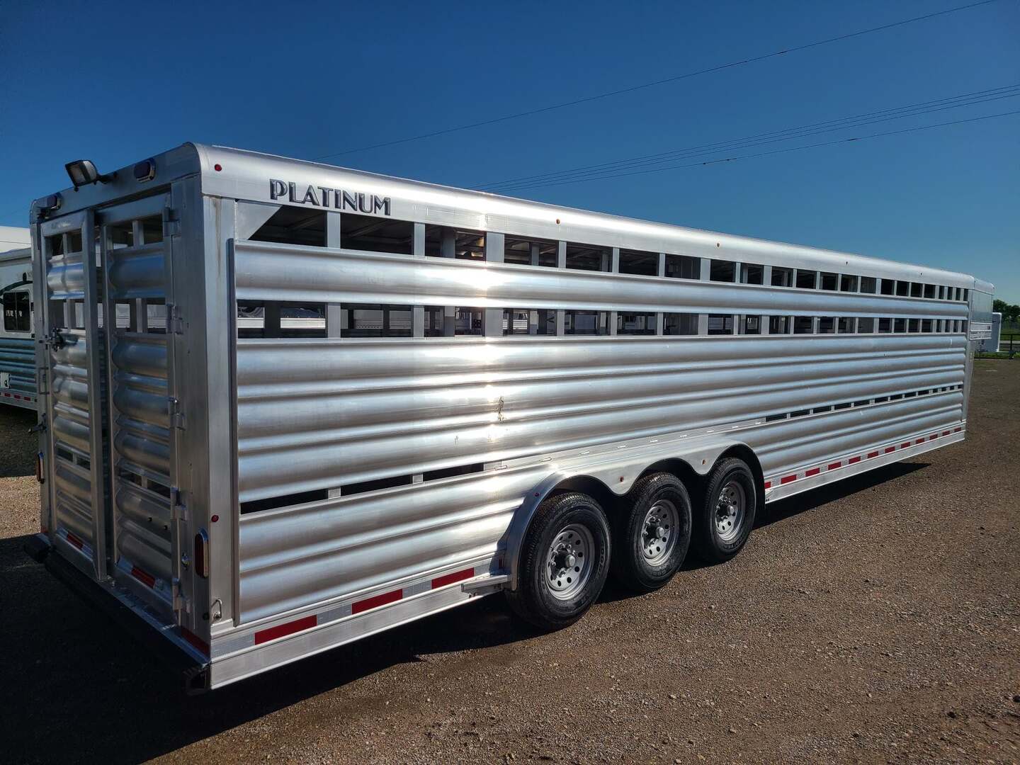 THIS TRAILER IS ON ORDER AND WILL ARRIVE IN NOVEMBER Platinum Coach 32’ Stock Trailer  3-7,200# AXLES Mill Finish exterior skin 235/80R 16” spare 8 WIDE X 7” TALL Two 10’4” sections, one 11’4” section Corrugated aluminum floor Anti-Slip rods at rear Slider on rear gate Stock escape door at head side 7 lights on top rail Halogen load at rear 2” air crack 22” off floor