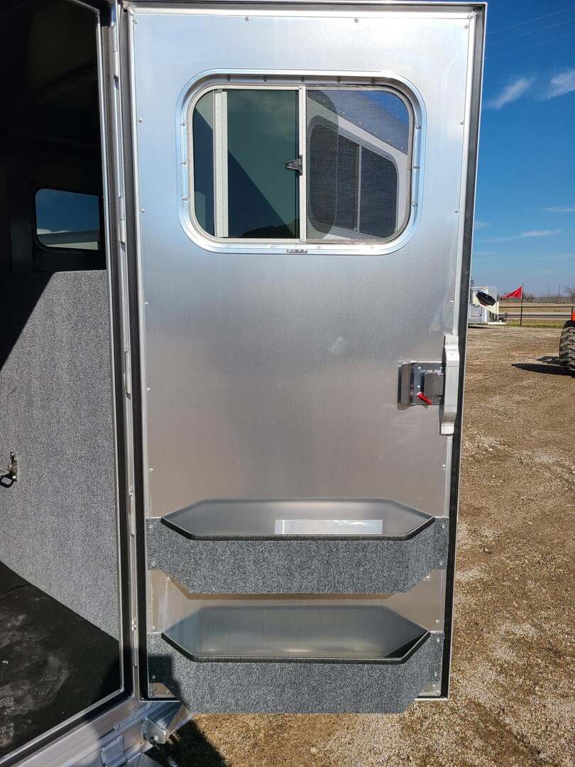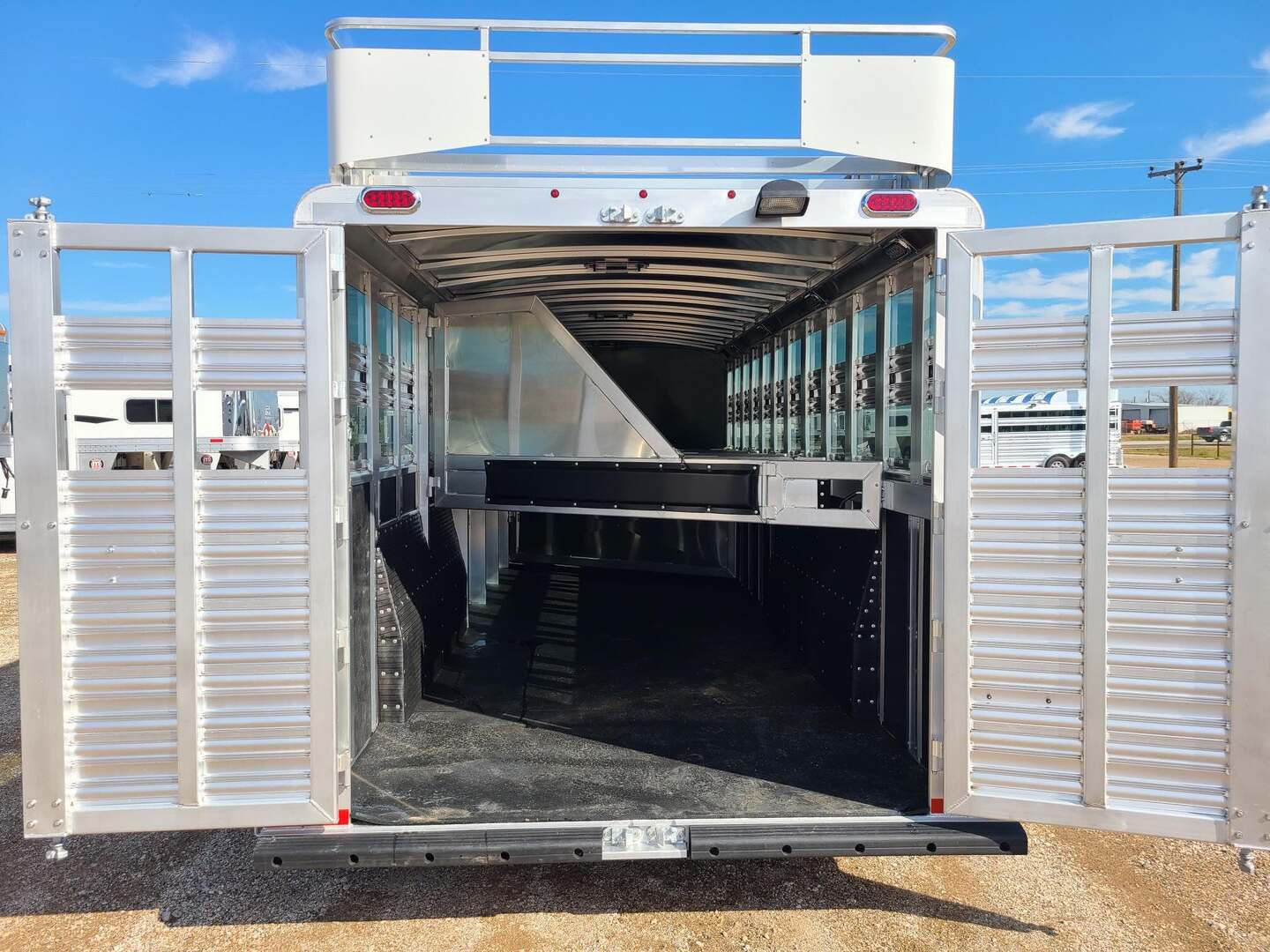 THIS TRAILER IS ON ORDER AND WILL ARRIVE IN DECEMBER Platinum 6 Horse Stock Combo 7’6” wide x 26’ long x 7 tall 3’ short wall dressing room with 6 saddle racks and 4 blanket bars Carpet on bulkhead wall with 20 hooks Two brush trays on tack door Floor mats running entire trailer floor length 5-39” stalls and one 81” stall head side at rear Double rear gates 6’ hay rack and ladder 3 roof vents Rubber on side walls 4 outside halogen load lights Plexiglas & track on sides Stock escape door Stainless steel nose 7,000# axles with 10 ply tires