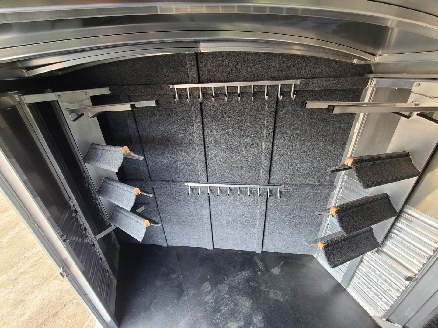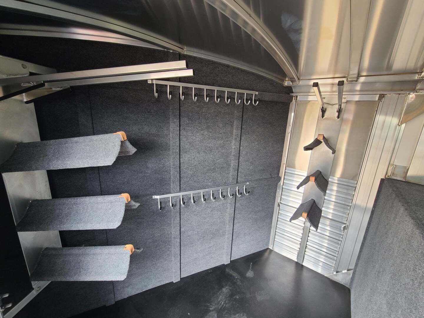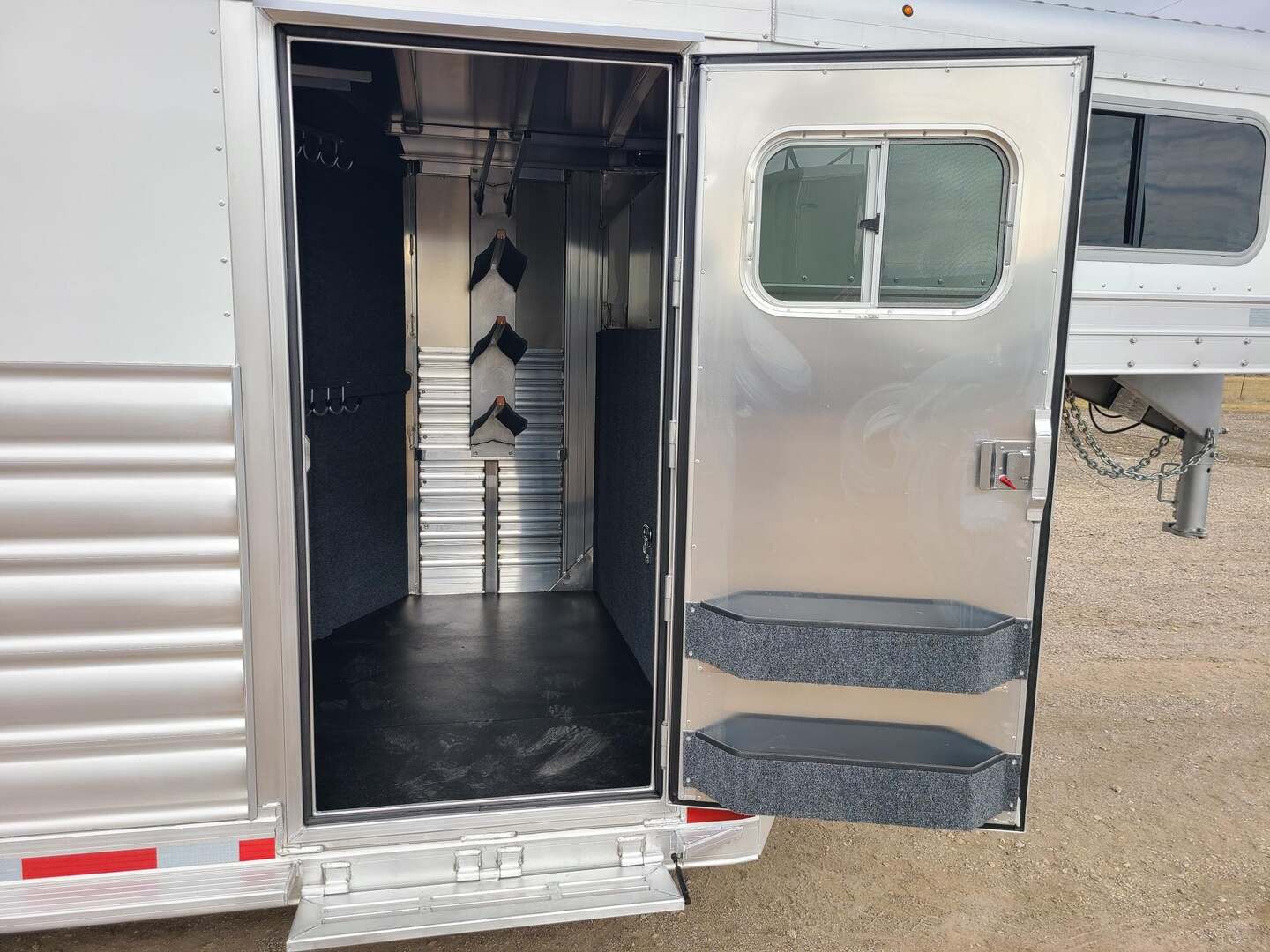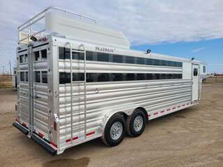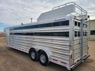 Platinum 6 Horse Stock Combo 7’6” wide x 26’ long x 7 tall 3’ short wall dressing room with 6 saddle racks and 4 blanket bars Carpet on bulkhead wall with 20 hooks Two brush trays on tack door Floor mats running entire trailer floor length 5-39” stalls and one 81” stall head side at rear Double rear gates 6’ hay rack and ladder 3 roof vents Rubber on side walls 4 outside halogen load lights Plexiglas & track on sides Stock escape door Stainless steel nose 7,000# axles with 10 ply tires