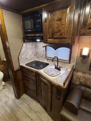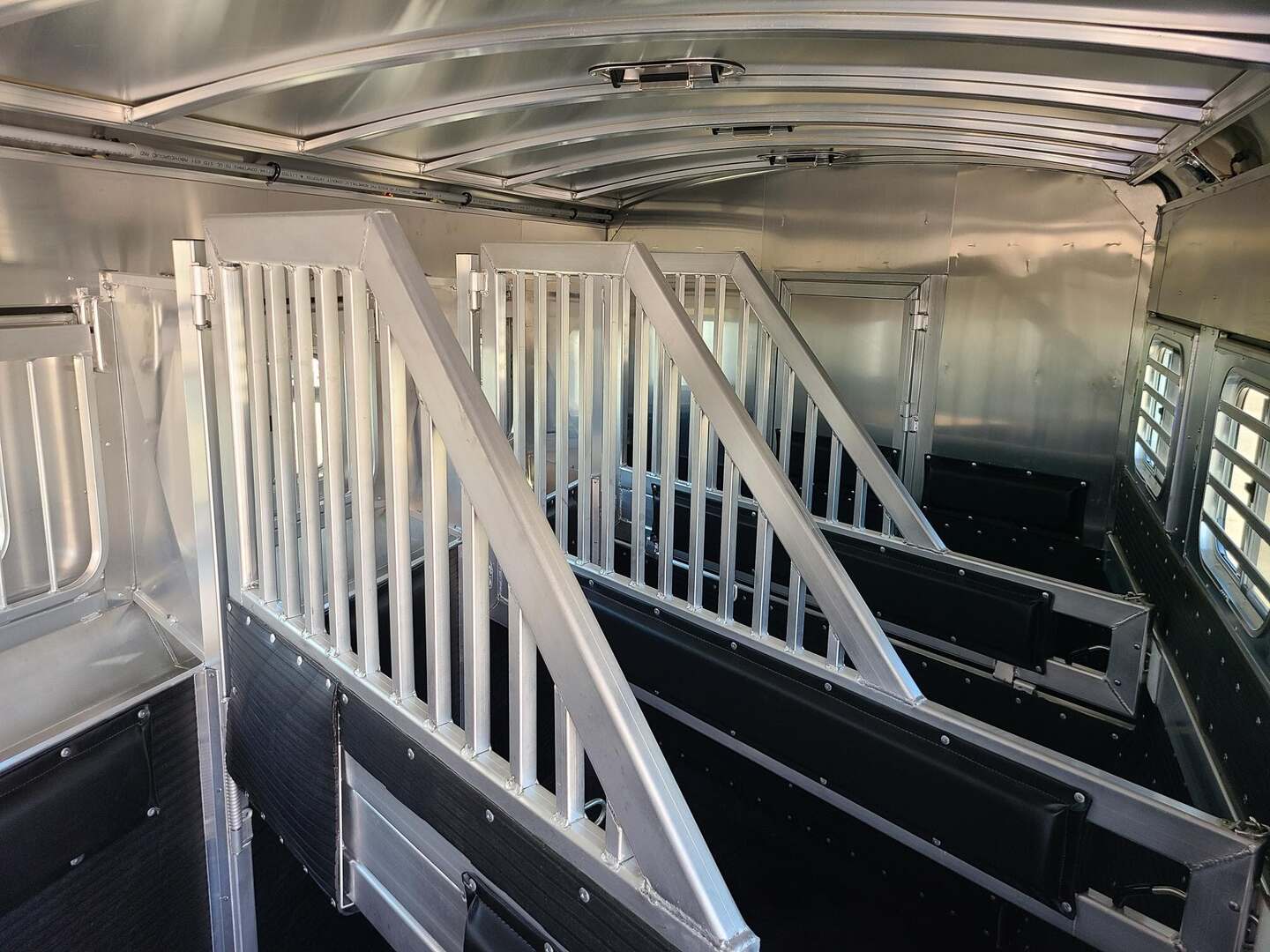 THIS TRAILER IS ON ORDER AND WILL ARRIVE IN JANUARY Platinum Coach 4 horse with 12’ 8” Short wall Outlaw Proline XP Conversions interior SIDE LOAD Outlaw Features: 12’ 8” short wall Dark Knotty Alder raised panel cabinetry Onan 4.0 MicroQuiet generator Hyrdaulic jack 15,000 BTU A/C ducted 20,000 BTU furnace Electric power awning...NICE!!! 6 gallon hot water heater with Propane and 120vAC heat 60 gallon water tank AM/FM/CD/DVD player with 2 interior and 2 exterior speakers 24” LED flat screen on arm 72” sofa sleeper with leather acccent Corner bench with storage below Almond sinks in kitchen and bath 6.0 refrigerator Microwave oven Two burner cooktop Extra wide pocket door to bathroom 32” radius shower with skylight in clear glass Porcelain toilet with foot flush Platinum Coach features: 8 wide x 32’ long x 7’6” tall Full width rear tack, side load 3 mangers with escape door at head Drop down window bars on head side Drop down windows on curb side 6’ hay pod 24” walk through door Baby panel on first divider 2” Blocked axles for additional ground clearance 4 outside halogen load lights 4 tier swing out blanket bar 8,000# axles 14 ply Goodyear tires on Mag Aluminum wheels