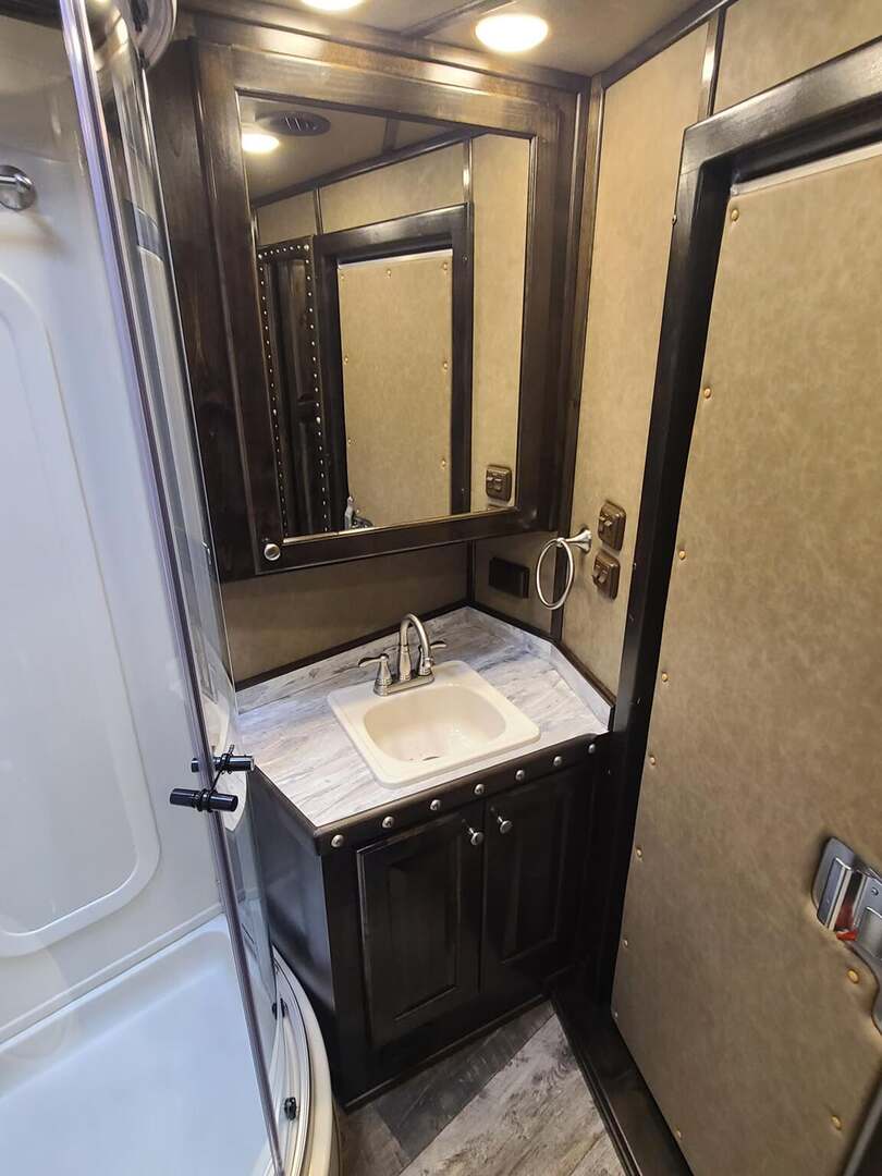 THIS TRAILER IS ON ORDER AND WILL ARRIVE IN JANUARY Platinum Coach 4 horse with 10’ 8” Short wall Outlaw Proline XP Conversions interior SLIDE OUT with 72” Sofa Sleeper SIDE LOAD Platinum Coach features: 8 wide x 30’ long x 7’6” tall 70/30 Rear Doors & SIDE LOAD 3 mangers with escape door at head Drop down window bars on head side Drop down windows on curb side 6’ hay pod & ladder 24” walk through door Baby panel on first divider 2” Blocked axles for additional ground clearance 4 outside halogen load lights 4 tier swing out blanket bar 8,000# axles 14 ply Goodyear tires mounted on MAG ALUMINUM WHEELS Outlaw Conversions Features: 10’ 8” short wall 72” Sofa Sleeper in 6’ ELECTRIC SLIDE OUT Dual-Hydraulic Jacks Dark Alder Brio cabinetry Wardrobe in nose Onan 4.0 MicroQuiet generator on Platform 15,000 BTU A/C ducted with HEAT PUMP 20,000 BTU furnace Electric power awning...NICE!!! 6 gallon hot water heater with Propane heat 60 gallon water tank AM/FM/CD/DVD player with 2 interior and 2 exterior speakers 24” LED flat screen on arm Fiberglass kitchen sink & faucet 2 Hardwood hat racks over R/V door 6.0 refrigerator 2 Burner flush glass cover cooktop w/ venthood Microwave oven Extra wide pocket door to bathroom 32” radius shower w/ bronze glass door & skylight Porcelain toilet with foot flush Mirrors in wardrobe cabinet doors & full length mirror Additional Day/Night Shades