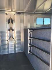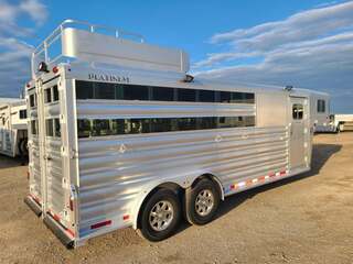 Platinum Coach 21’ Stock Combo 7’6” wide x 21’ long x 7’ tall Mill Finish exterior skin 4’ short wall dressing room 3 tier SWING OUT saddle rack on curb side of dressing room 3 tier saddle rack on driver side 4 swinging blanket bars on drop wall Carpeted dressing room, bed, drop and bulkhead wall Carpet on tack door  Brush tray and 5 hooks on tack door 10 hooks on carpeted bulkhead wall Plexiglas & track on both sides, open at the back Rubber on side walls and rear gates 6’ hay rack w ladder Mag aluminum wheels 7,000# axles & 10 ply tires Baby/Stud panel on first divider Break divider on last divider Stock escape door Stainless steel on nose 3 roof vents in horse compartment Double rear doors 4 outside halogen load lights LED lights on inside, 2 horse area, 2 tack Dividers can be removed to haul cattle!! HANDIER THAN A POCKET ON A SHIRT!!