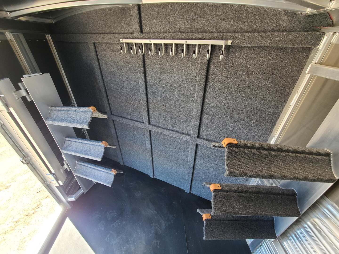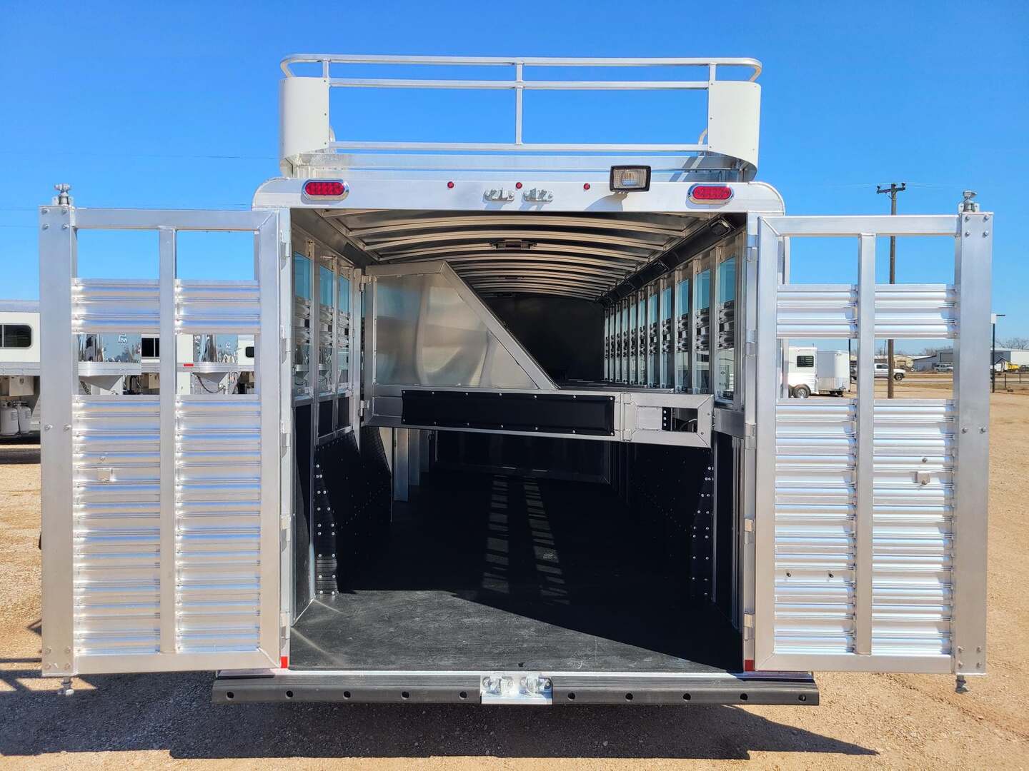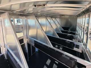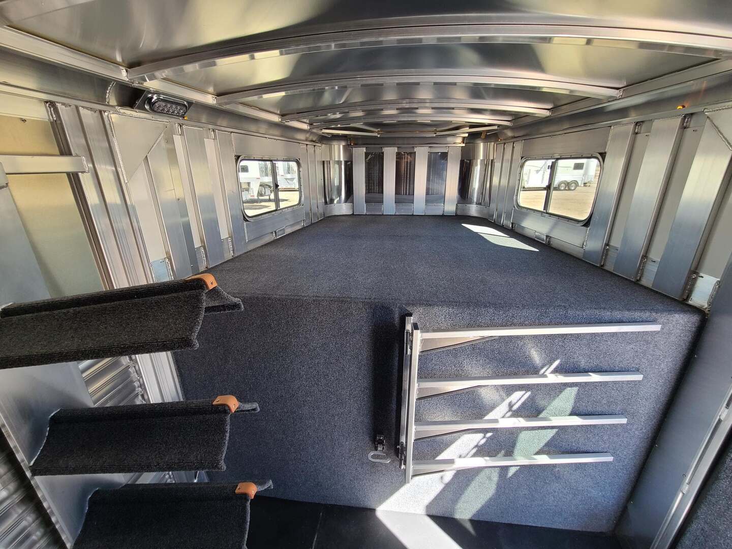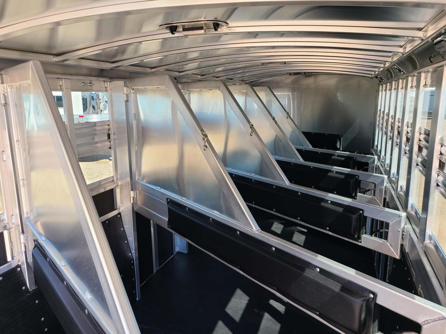 THIS TRAILER IS ON ORDER AND WILL ARRIVE IN NOVEMBER Platinum 6 Horse Stock Combo 7’6” wide x 26’ long x 7 tall 3’ short wall dressing room with 6 saddle racks and 4 blanket bars 3 swing out saddles, 3 on back wall Carpet on bulkhead wall with 20 hooks One brush tray on tack door Floor mats running entire trailer floor length 5-39” stalls and one 81” stall head side at rear Double rear gates 6’ hay rack and ladder 3 roof vents Rubber on side walls 4 outside halogen load lights Plexiglas & track on sides Stock escape door Stainless steel nose 7,000# axles with 10 ply tires 7 round LED clearance lights 4 LED load lights 6 inside LED lights