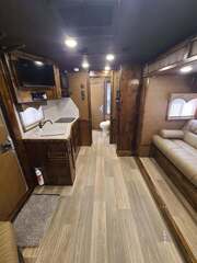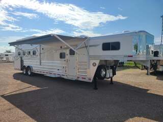 THIS TRAILER IS ON ORDER AND WILL ARRIVE IN FEBRUARY Platinum Coach 4 horse with 13’8” Short wall Proline XP by Outlaw Conversions interior SLIDE OUT with 72” Sofa Sleeper and Corner Bench with SIDE LOAD Platinum Coach features: 8 wide x 33’ long x 7’6” tall 70/30 Rear Doors & SIDE LOAD 3 mangers with escape door at head Drop down window bars on head side Drop down windows on curb side 8’ hay pod & ladder 24” walk through door Baby panel with rubber on first divider Flow through and swing back dividers 2” Blocked axles for additional ground clearance 4 outside halogen load lights 4 tier saddle rack, surrounded by 30 hooks!! 4 tier swing out blanket bar Three shelves in curb side of rear tack area Flow through style steps 10,000# axles 18 ply tires & 17.5” aluminum wheels Flip down 4’ bench  LED load lights Proline XP by Outlaw Conversion Features: 13’8” short wall 72” Sofa Sleeper in 6’ ELECTRIC SLIDE OUT Corner bench next to R/V door Dual-Hydraulic Jacks Dark Knotty Alder cabinetry Wardrobe in nose Onan 4.0 MicroQuiet generator on Platform 15,000 BTU A/C with heat pump 20,000 BTU furnace Electric power awning...NICE!!! 6 gallon hot water heater with Propane heat 60 gallon water tank AM/FM/CD/DVD player with 2 interior and 2 exterior speakers TWO 32” LED flat screens on arm Double bowl almond kitchen sink & faucet 2 Hardwood hat racks over R/V door 6.0 refrigerator Glass cover 2 Burner cooktop Microwave oven with vent hood Extra wide pocket door to bathroom 32” radius shower w/ bronze glass door & vent overhead Porcelain toilet with foot flush Mirror next to walk through door