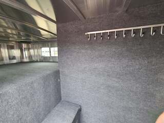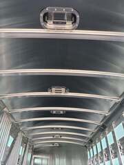 Platinum Coach 6 horse Perfect Trainer / Side Tack!! 7’6” wide x 27’ long x 7 tall Side tack with 6 saddles, 6 bars, 4 brush trays, 30 bridle hooks!!!! Dressing room with boot box, carpet on walls, and hooks on slant wall Clothes rod in dressing room nose area, curb side Full width shelf above saddle racks & blanket bars Plexiglas & Track on driver and passenger side, not rear gates Flow through dividers and stud divider with rubber on first divider Glued stall mats on driver and passenger side Break divider on last stall, allows divider to fully open when rear gates are closed 6 two-way roof vents in horse compartment...MAX AIR FLOW!! Flow through steps for side tack and dressing room 6’ hay rack 7 lights on top rail 7 halogen load lights 7200# axles & 14 ply tires Aluminum 16” wheels Stainless Steel on Nose White Exterior Skin